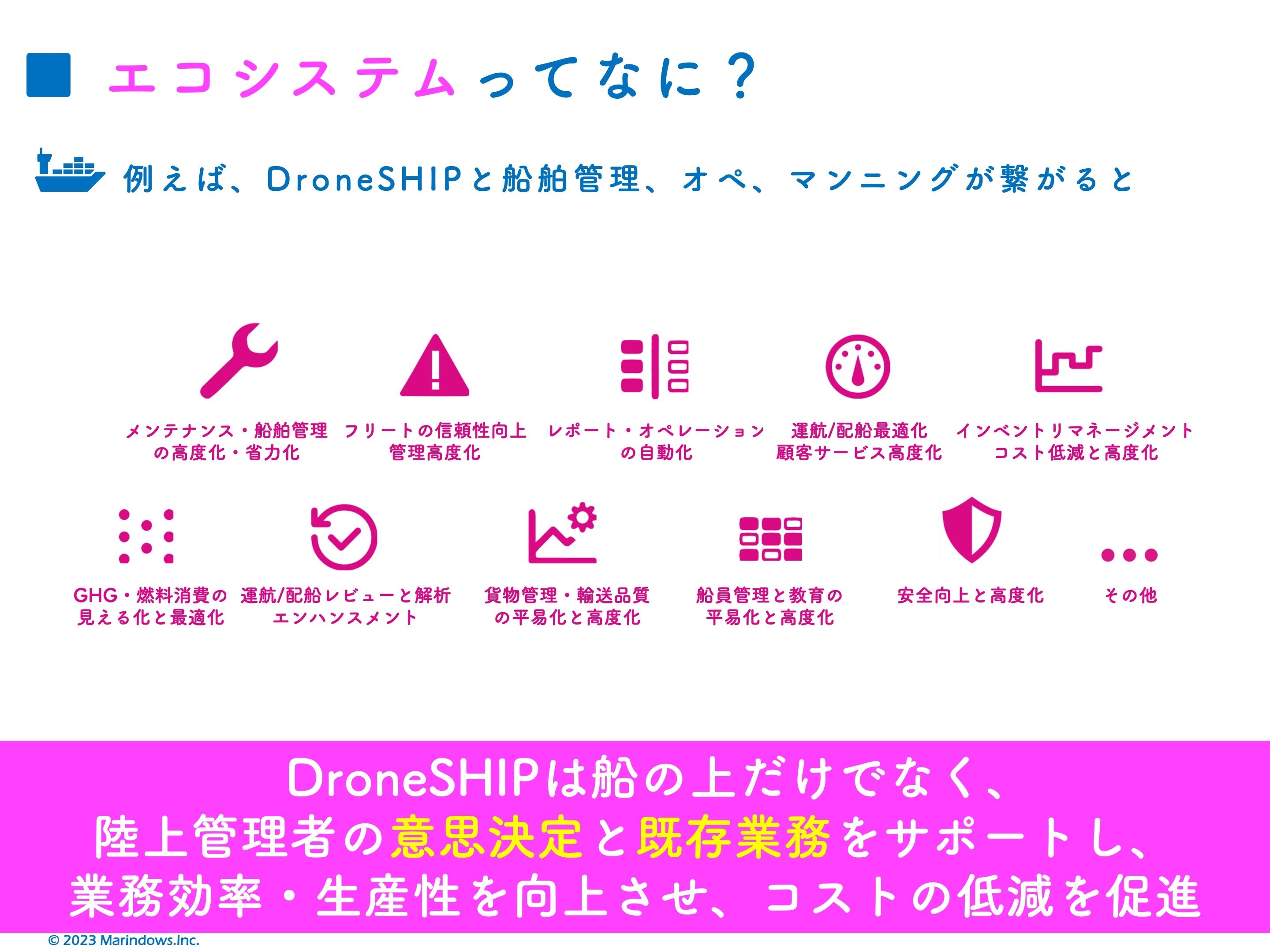Marindowsは、DroneSHIPによって創出される新しいインフラを通して内航海運が抱える課題の解決に留まらず、海洋国家日本の根幹インフラである内航海運が未来永劫も持続可能な存在であり続けるために、同じ未来を志すパートナー企業と共に、『もっと魅力的で』『もっとワクワクする』内航海運と海洋国家日本の未来を創ります。