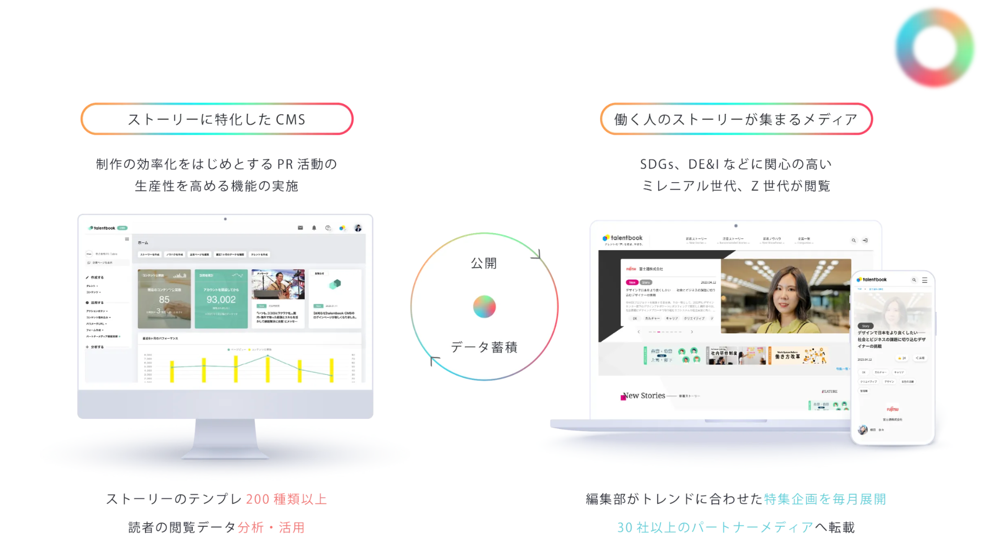 『talentbook』は、「働く人」から企業の魅力を伝える採用ブランディングサービスです。企業の魅力と求職者のイメージギャップを埋めるための採用戦略をプランニングし、コンテンツの企画から、つくる、届けるを通してリーチ量や滞在時間、アクションデータを蓄積。PDCAを回しながら企業に最適化したデジタルPR施策をワンストップで提供します。