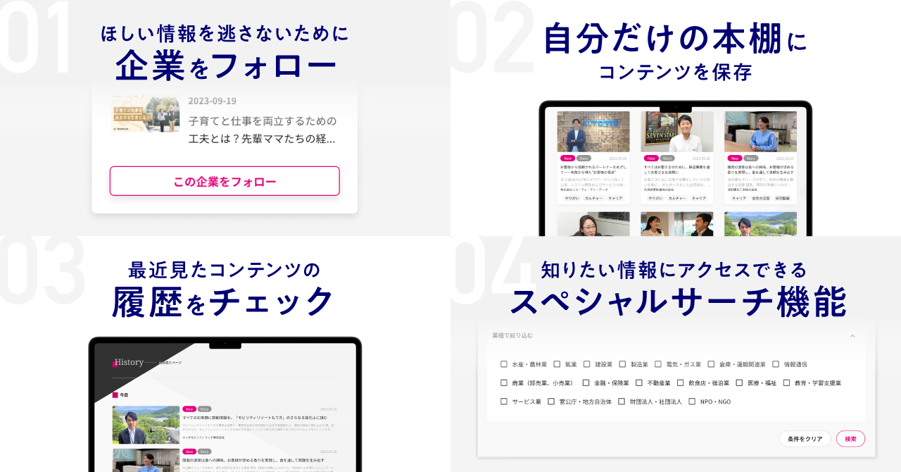 そうした求職者のニーズに答えるため、より詳細な検索機能やパーソナライズしたコンテンツの情報をコレクションしていくことができる会員向け機能を実装いたしました。