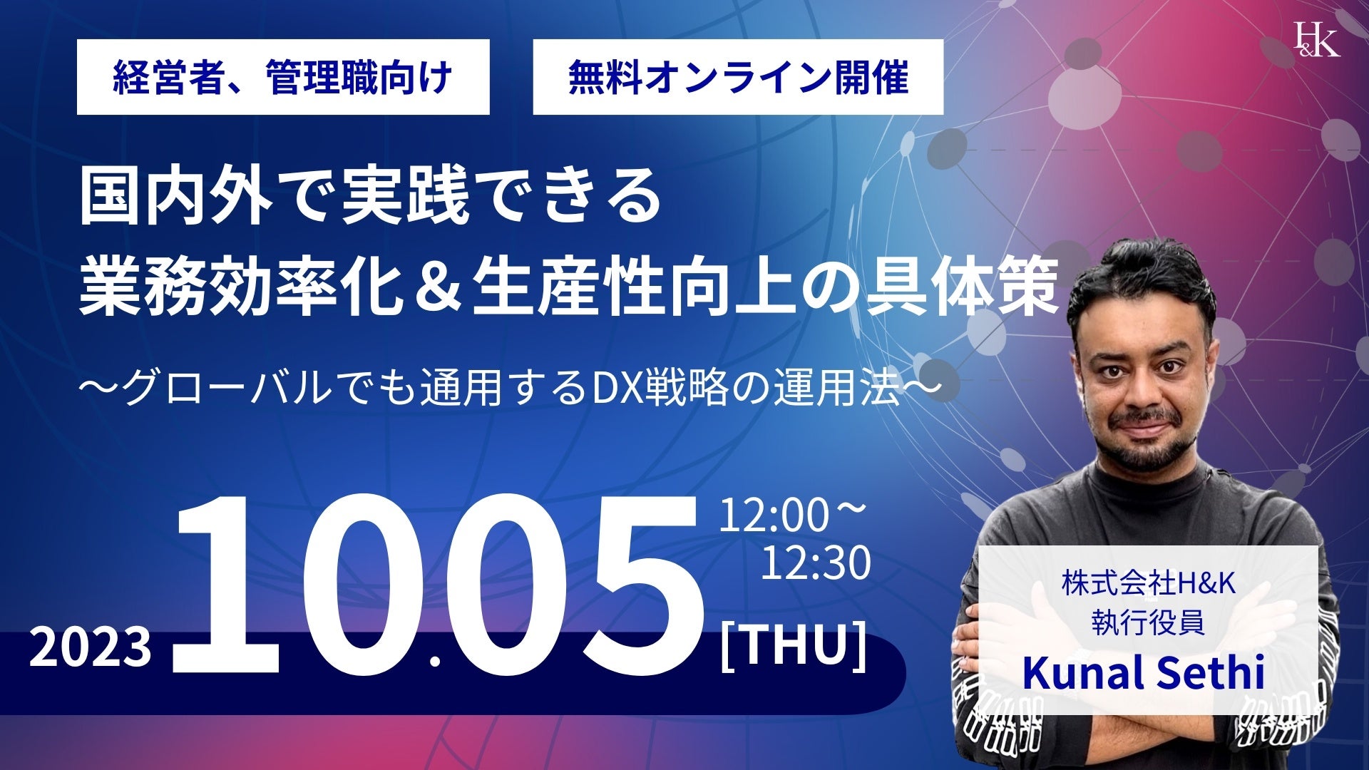 株式会社H&Kは、2023年10月5日(木)12:00〜12:30の日程でZOOMにて「【経営者、管理職向け】国内外で実践できる業務効率化&生産性向上の具体策〜グローバルでも通用するDX戦略の運用法〜」と題してセミナーを開催いたします。