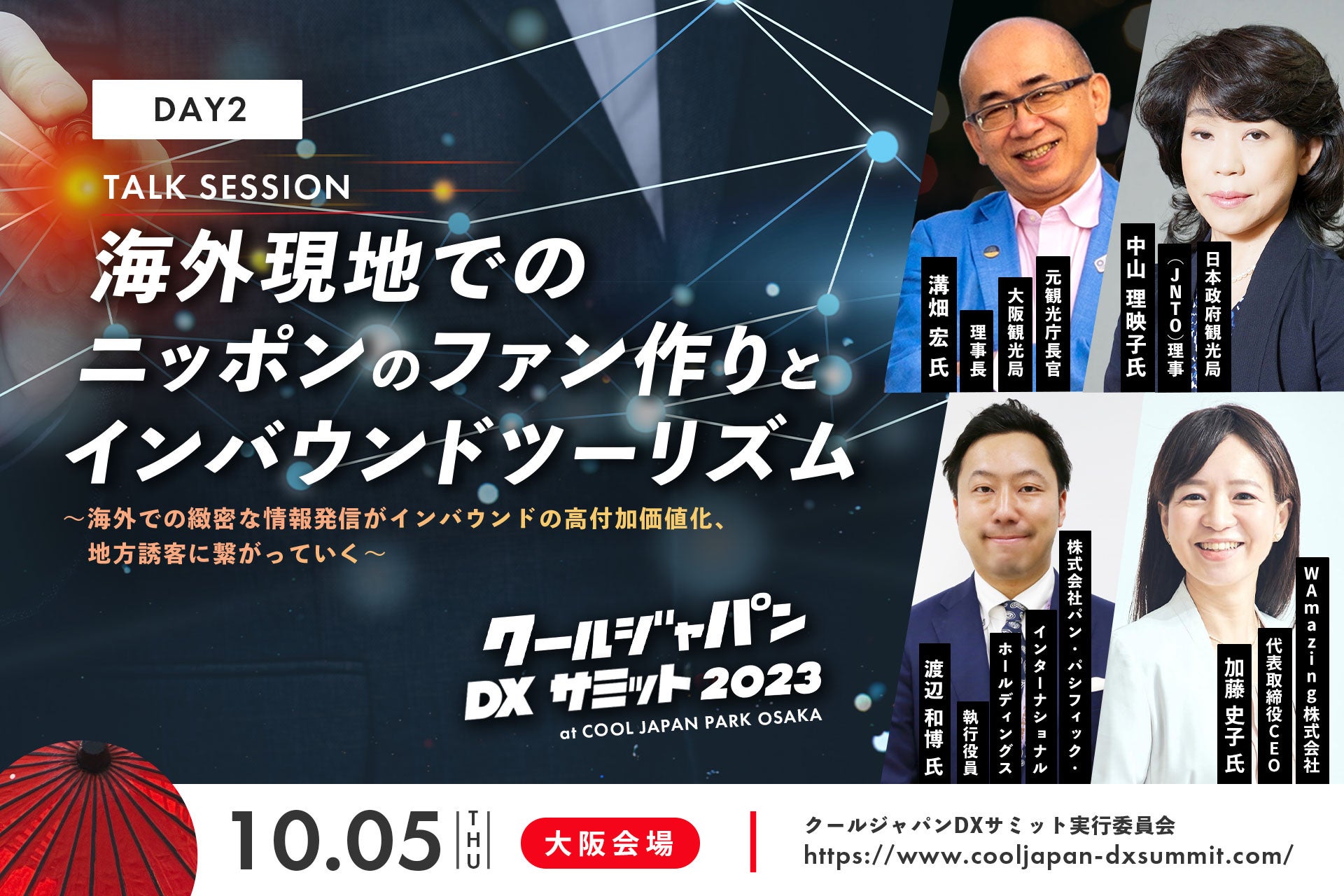 クールジャパンDXサミット実行委員会(運営事務局:Vpon JAPAN株式会社、本社:東京都新宿区、代表取締役社長:篠原 好孝、以下Vpon JAPAN)は、2023年10月4日(水)~10月5日(木)に開催するクールジャパンDXサミット2023において、5日(木)に大阪会場で開催するDay2 04 Talk Sessionテーマと登壇者をご紹介します。