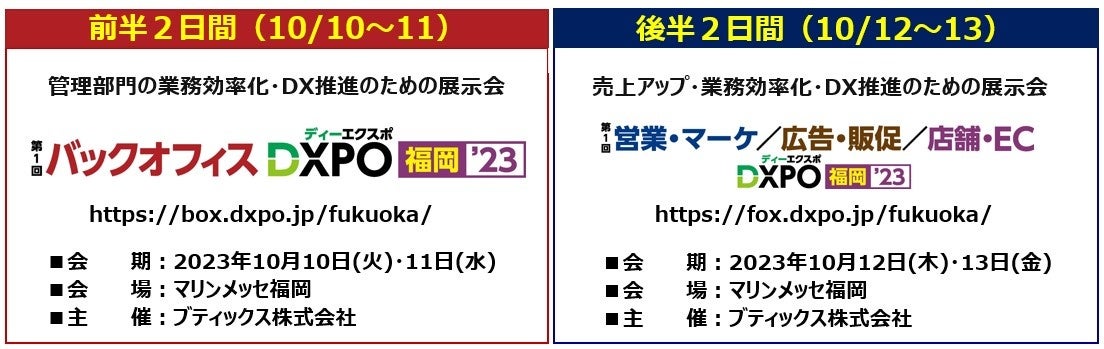 展示会事業、M&A仲介事業などを展開する、ブティックス株式会社(東京都港区、代表取締役社長 新村祐三、東証グロース上場 証券コード:9272)は、10月10(火)・11日(水)の2日間「第1回 バックオフィスDXPO福岡’23」をマリンメッセ福岡にて盛大に開催する。来場対象者は、あらゆる業種の経営層はもちろん、バックオフィス部門(総務・人事・労務・経理・財務・法務・情報システム等)の方々である。