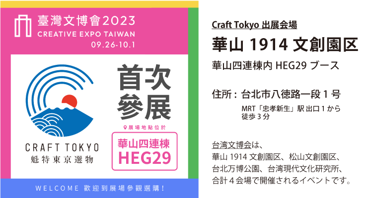 今年は台北市内の4つのクリエイティブスポットが会場になりますが、Craft Tokyoのブースは「華山1914文創園区」となります。赤峰街でスタートした体験型ショールーム事業を通して、日本メーカー様から届く様々な声を受けて、単独出展のハードルを下げた形で、少しでも多くのメーカー様がチャレンジ出来る機会を用意しました。
