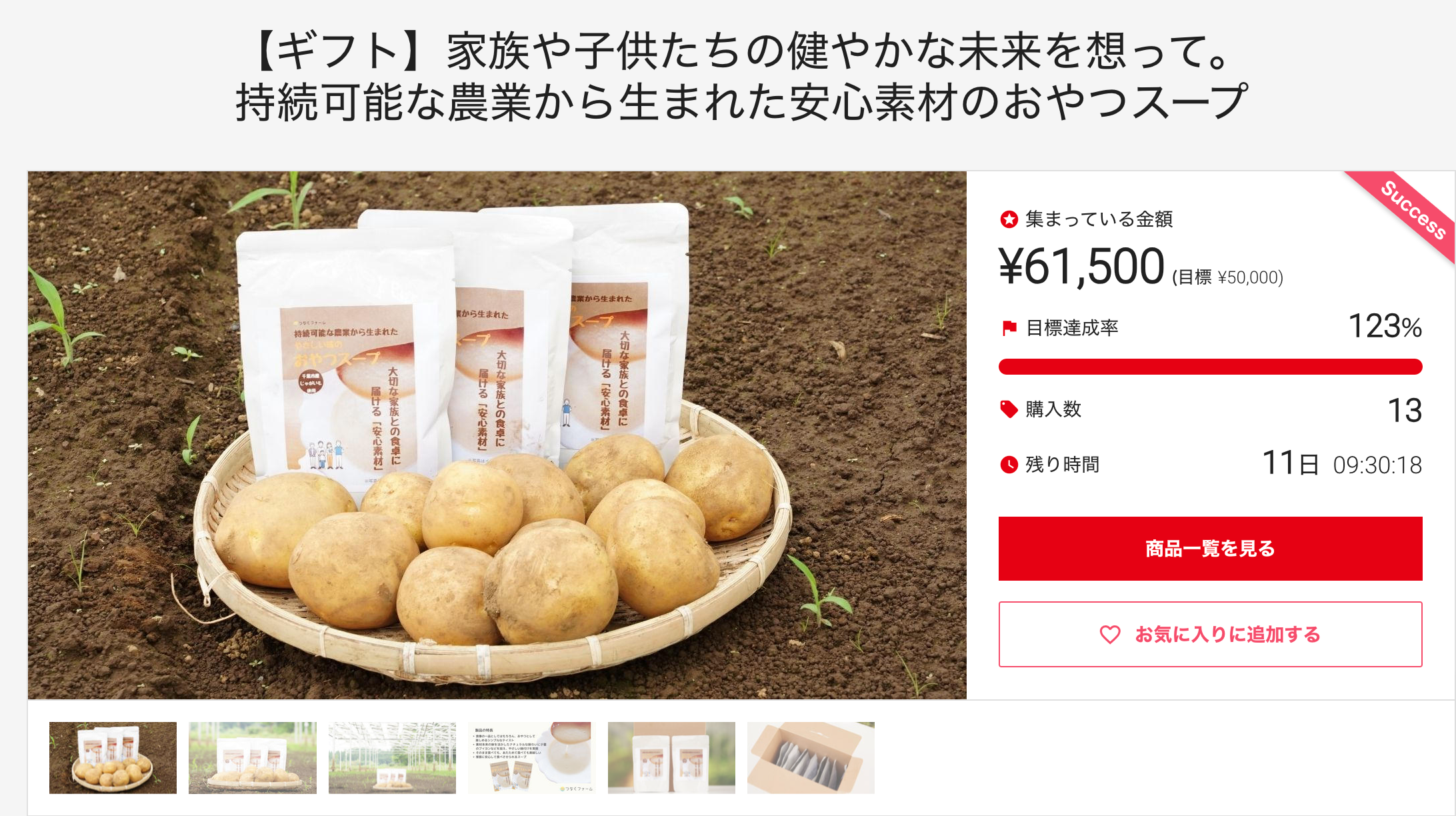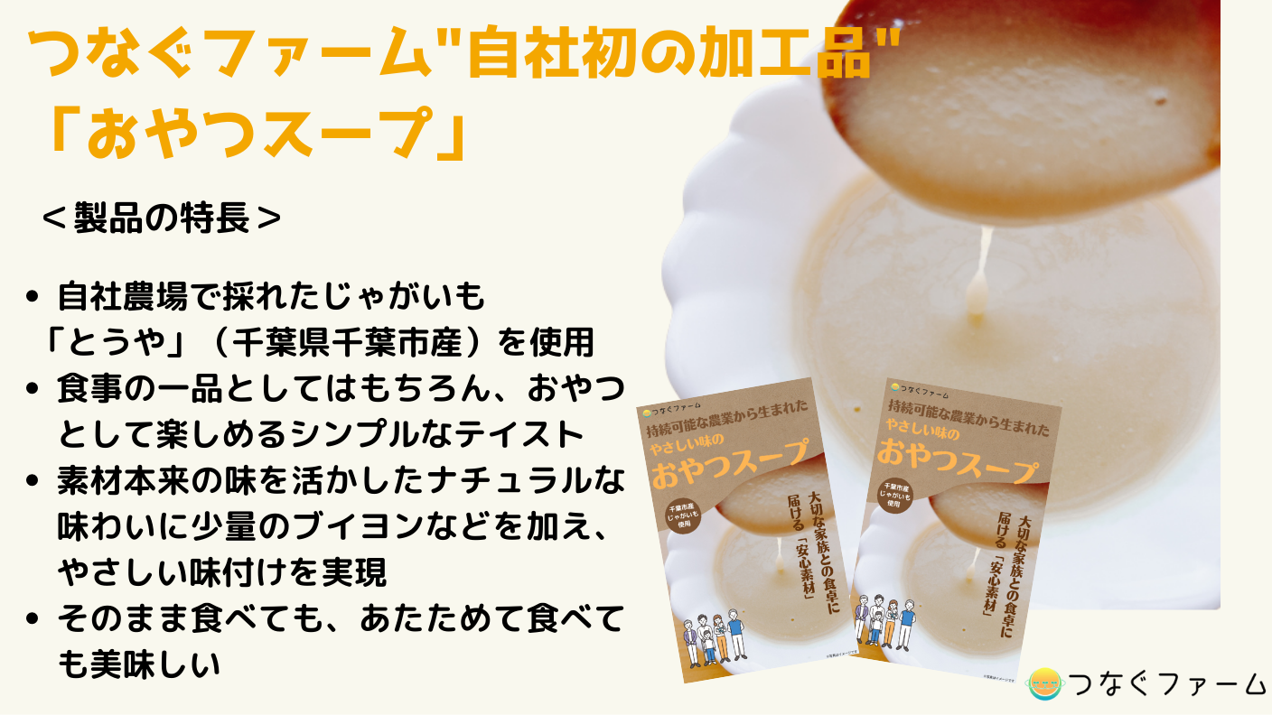 千葉エコ・エネルギー株式会社(本社:千葉県千葉市、代表取締役:馬上丈司)グループである株式会社つなぐファーム(本社:千葉県千葉市、代表取締役:富岡弘典)が2023年7月21日より地域商社「ちばぎん商店株式会社(代表取締役社長:小野 雅康)」が運営する購入型クラウドファンディングサイト「C-VALUEクラウドファンディング」にて、先行販売させていただいていた自社初となる加工品「おやつスープ」プロジェクトが目標金額を上回りプロジェクトを達成しました。販売期間は2023年9月30日まで。