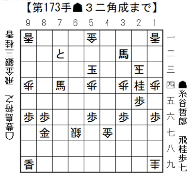 ▲2三飛 △同 飛 ▲同銀成 △同 玉 ▲3二角成まで173手で先手の勝ち