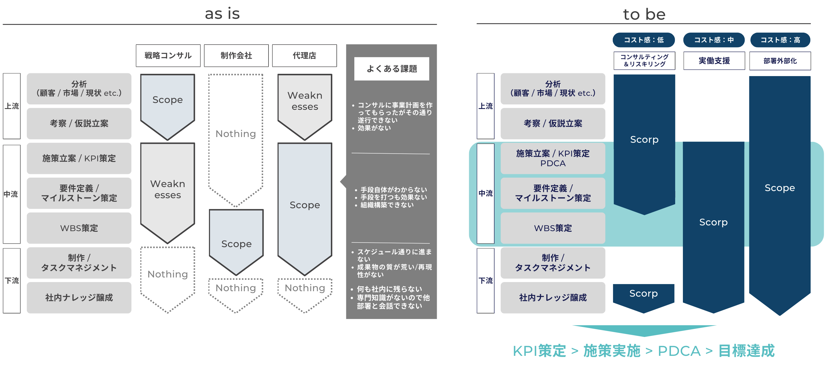 私たちは組織を見た上インハウス化でチーム最適化、粘り強いPDCAにおける根幹をお手伝いします。戦略だけの支援も可能ですが、施策実施を社員の方々と近しい位置で実行、仮説設計から意思決定に導き、KPIを達成するまでの目標達成に強みを持ちます。