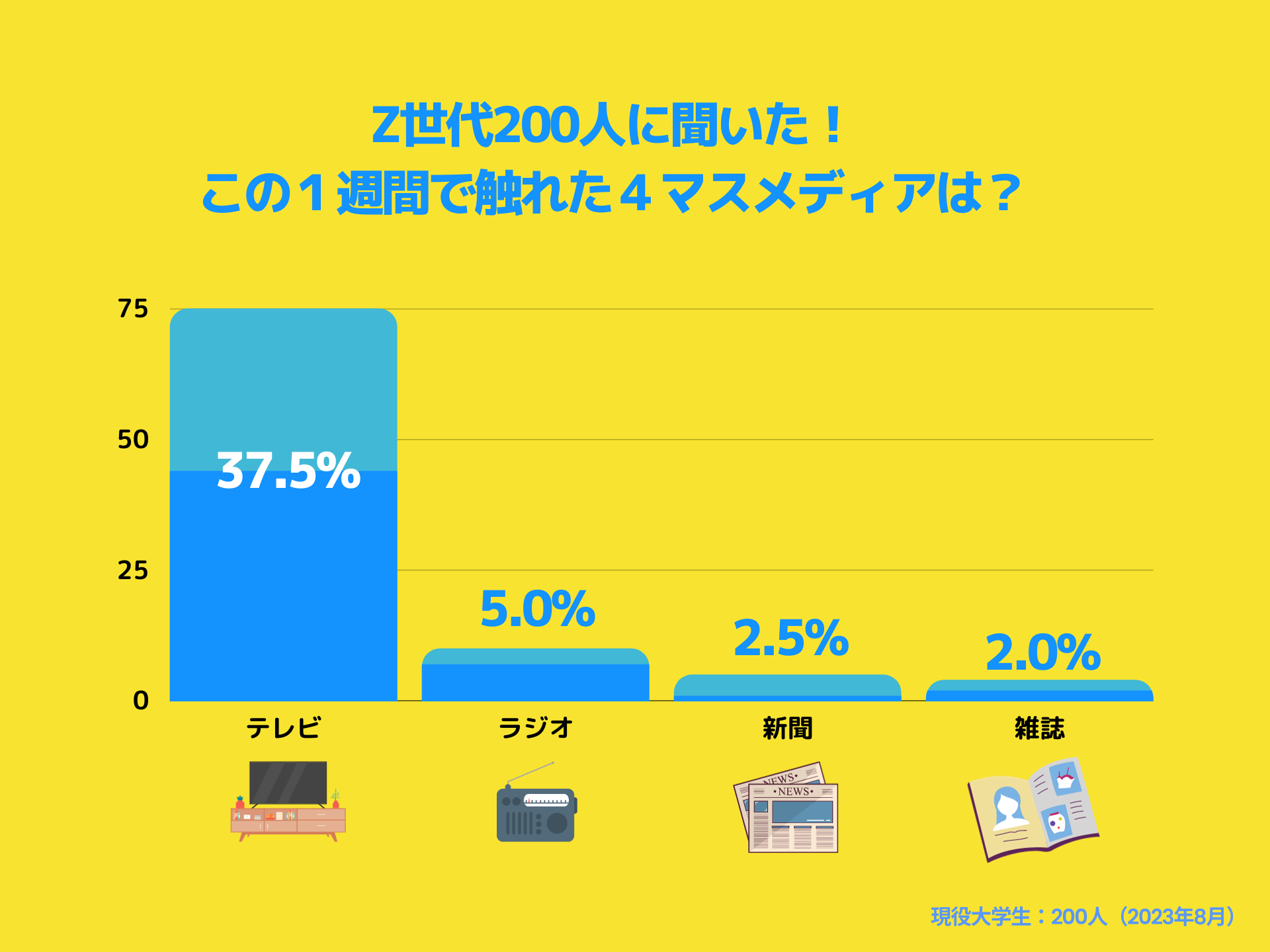 今回の調査結果は男女100名ずつ合計200名の現役大学生に聴取しました。その内訳を男女別に検証すると、テレビは女性44%、男性31%、ラジオは女性7%、男性3%、新聞は女性1%、男性4%、雑誌は女性2%、男性2%となりました。微差ではありますが、テレビ、ラジオは女性の方が接触傾向が高く、新聞や男性の接触傾向が高いようです。