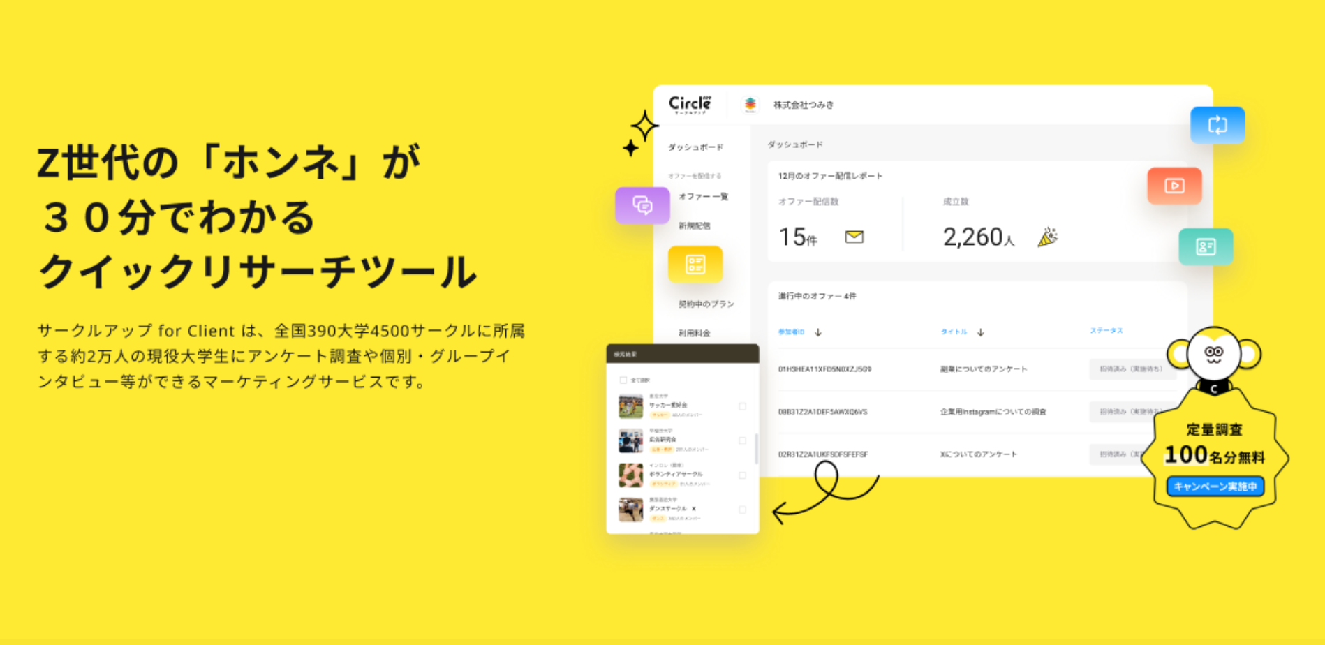 いかがでしたでしょうか?サークルアップは電通若者研究部が自らの研究ツールとして開発し、2022年6月に当社が事業売却を受けたクイックリサーチツール。約2万人の現役大学生が登録しており、100サンプルの調査が10〜30分で完了するなど、そのスピード感が特徴で、多くの企業様のマーケティング活動やリクルーティング活動にご活用いただいています。