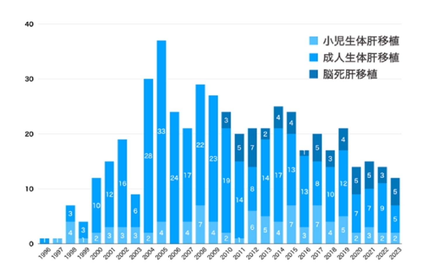 1996年の生体肝移植導入以降、生体肝移植総数は445例、2010年に開始した脳死肝移の植総数は56例で、脳死と生体合わせて肝移植の総数は501例となりました(2023年8月末現在)。