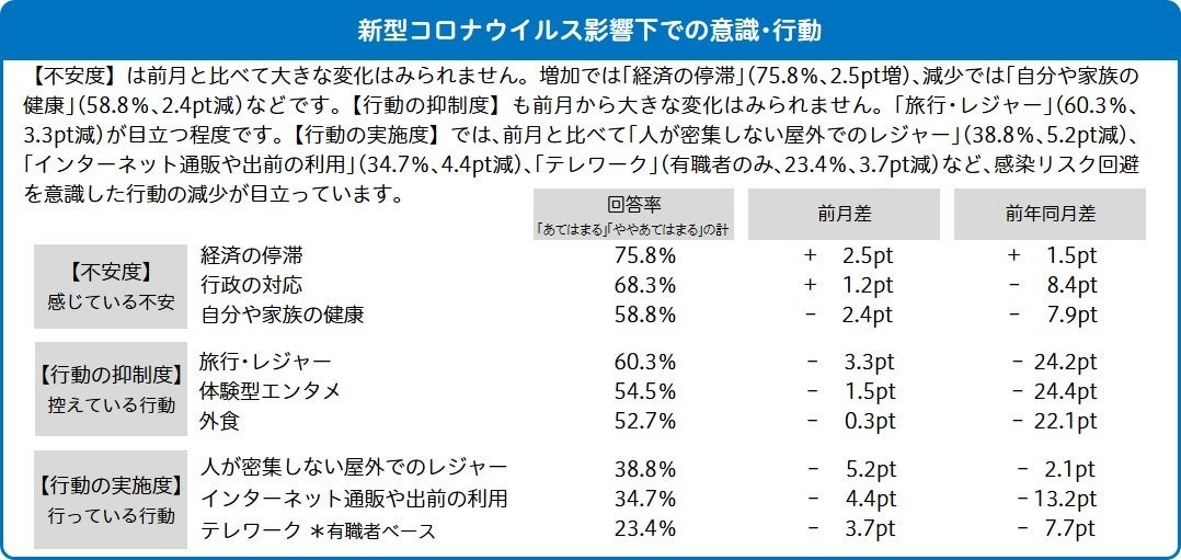 【調査前の状況】6月の新規感染者数は月初から減少傾向を続け、全国で1日1万人、東京都で1千人を下回る日もみられるようになりました。感染の沈静化傾向を受け、インバウンドの受け入れ再開や、旅行費用を支援する「県民割」の地域拡大方針が発表されるなど、政府も社会活動の活性化に動き始めました。ところが6月末になると感染者数は下げ止まり、増加に転じました。記録的に短い6月中の梅雨明けと猛暑、及び物価高の報道に加え、再びコロナ感染の拡大の兆しが見え始めた段階での調査です。