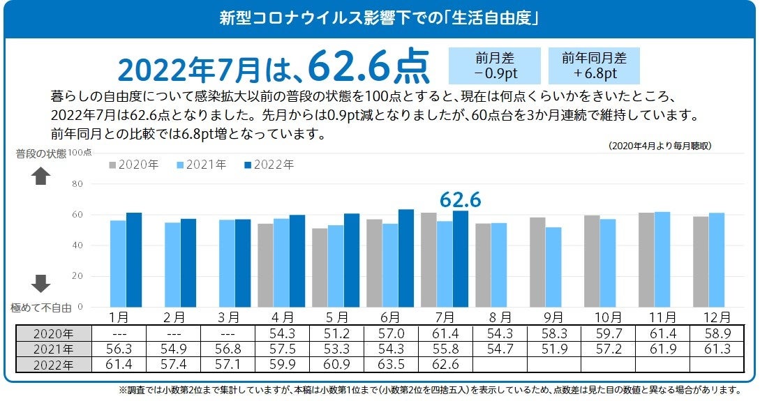 | 7月の「生活自由度」は62.6点で、60点台を3か月連続で維持。 「行動の抑制」が引き続き緩む |