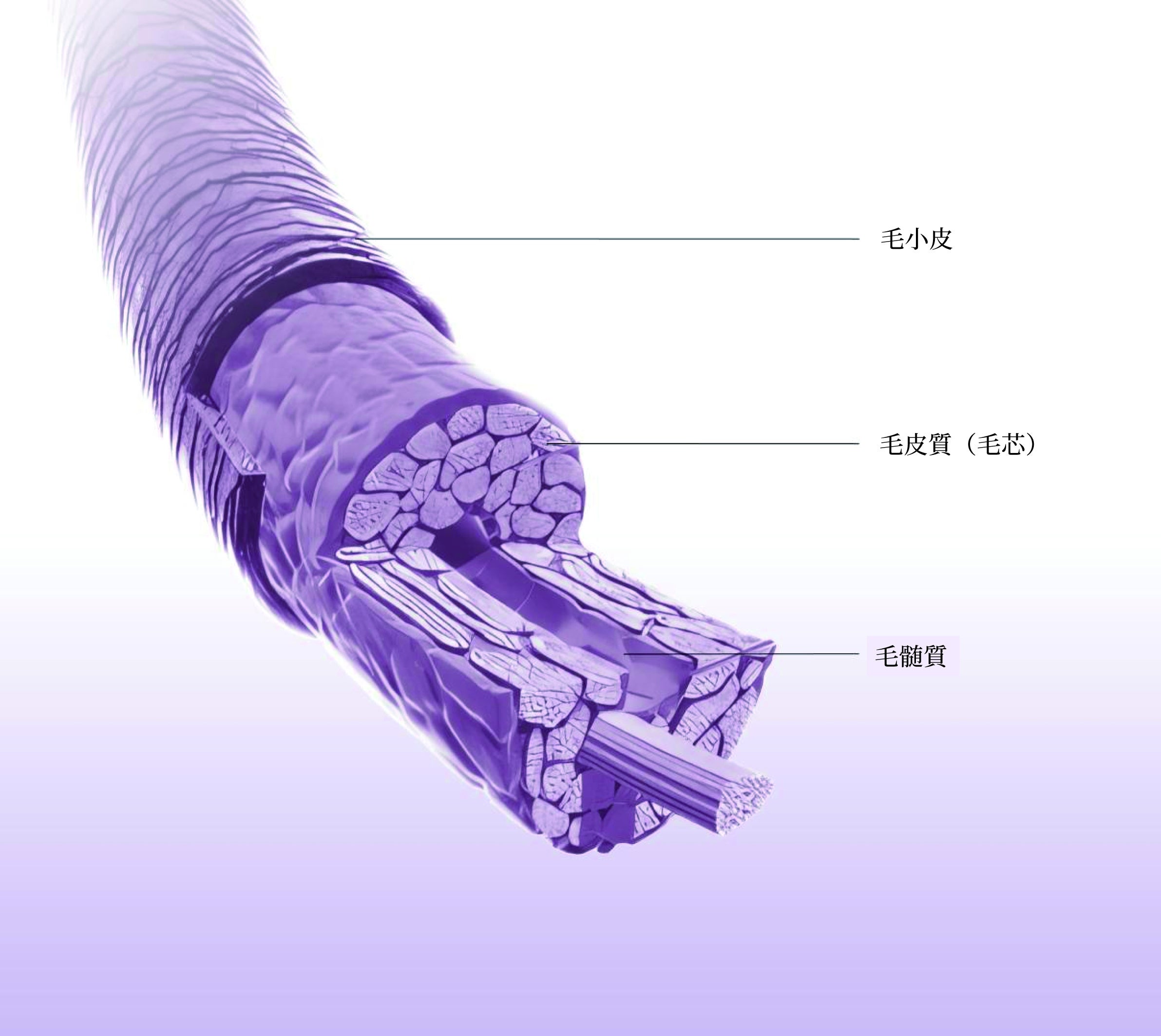 毛皮質(毛髪の中心部)は、毛髪の主要部分であり、毛髪内部の85% ~ 90% を占めます。 毛髪の中心部は主にαケラチンで構成されており、さまざまな化学結合によって架橋されています。この中心部は髪の色、弾力、強さ、質感などを決定し、毛髪が健康な状態を維持するためには、中心部の状態を良好に保つ必要があります。