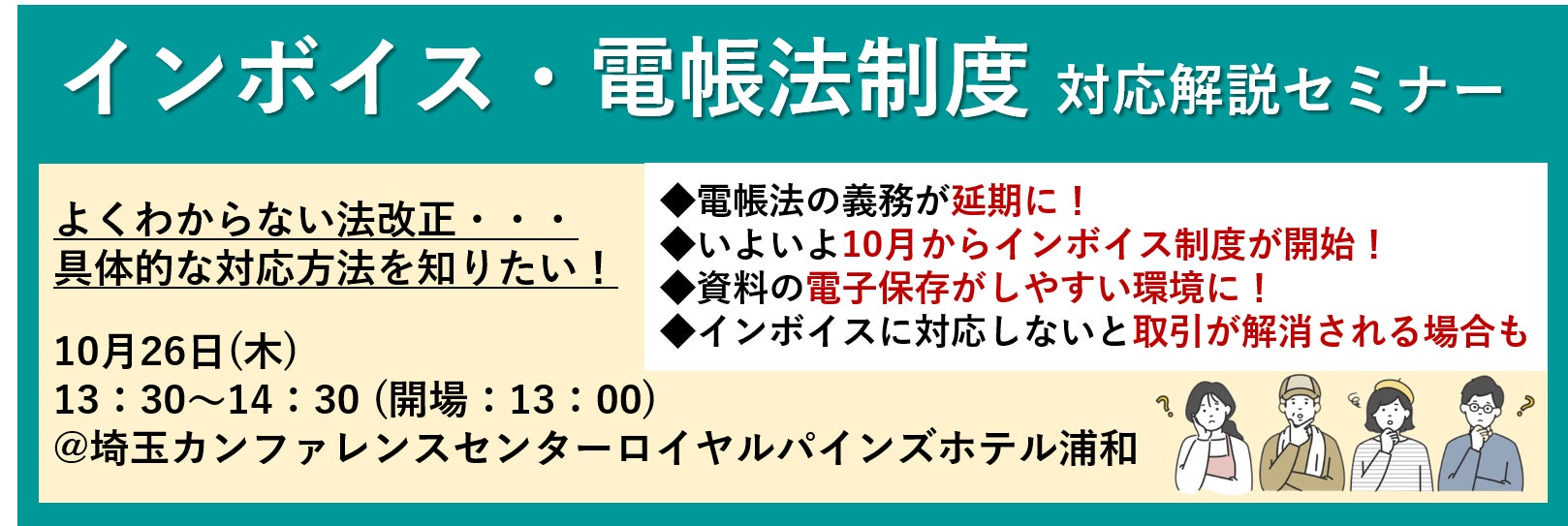 以下URLよりお申し込みください ※開催終了※【10月26日(木)開催!】インボイス×電子帳簿保存法対応セミナー - さいたま経理代行センター 特にこのような経営者におすすめです!! ● そもそもインボイス制度・電子帳簿保存法が何なのか分からない ● 法 |