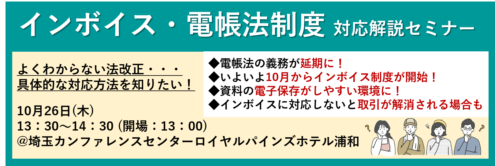 以下URLよりお申し込みください ※開催終了※【10月26日(木)開催!】インボイス×電子帳簿保存法対応セミナー - さいたま経理代行センター 特にこのような経営者におすすめです!! ● そもそもインボイス制度・電子帳簿保存法が何なのか分からない ● 法 |
