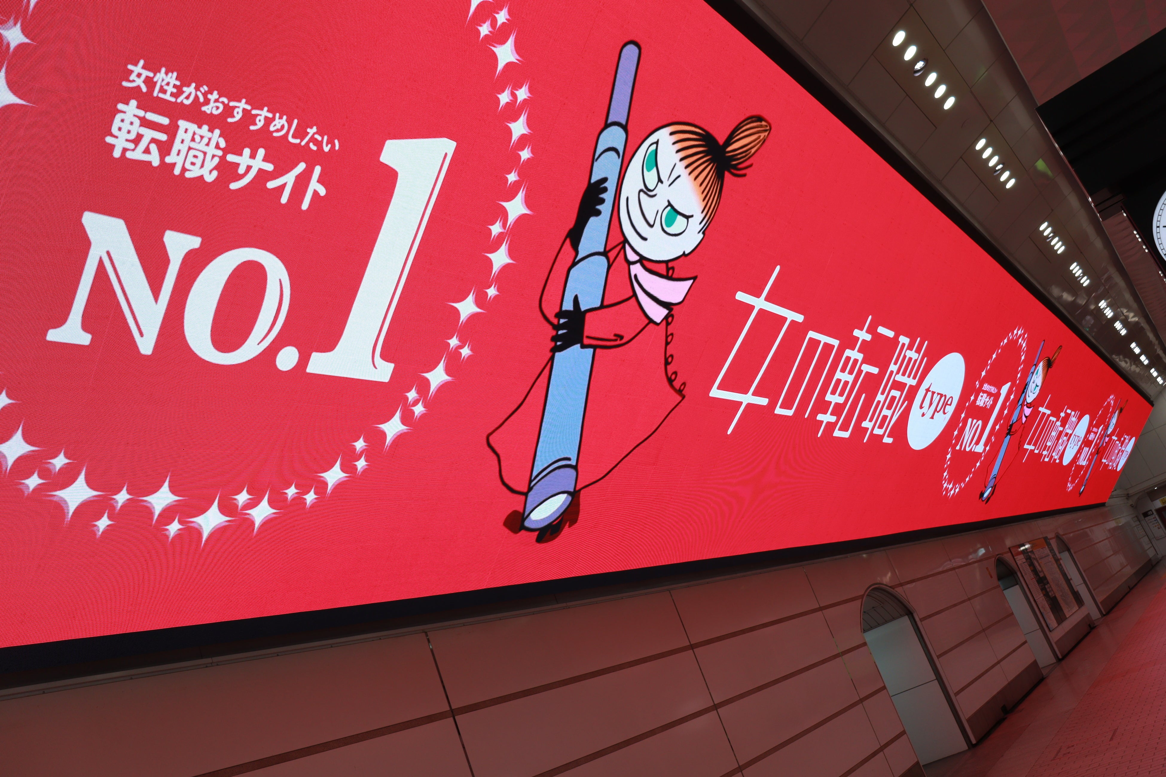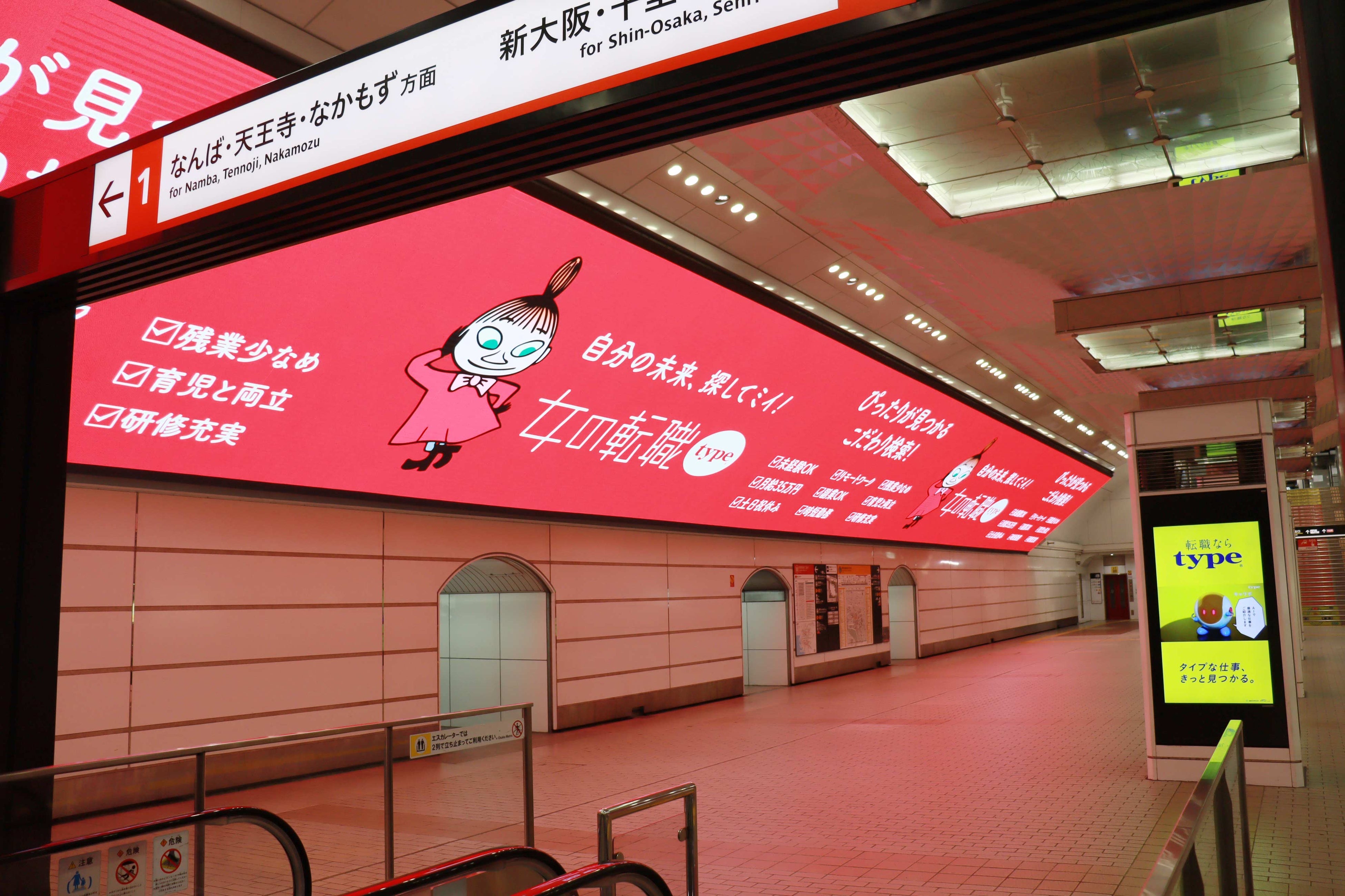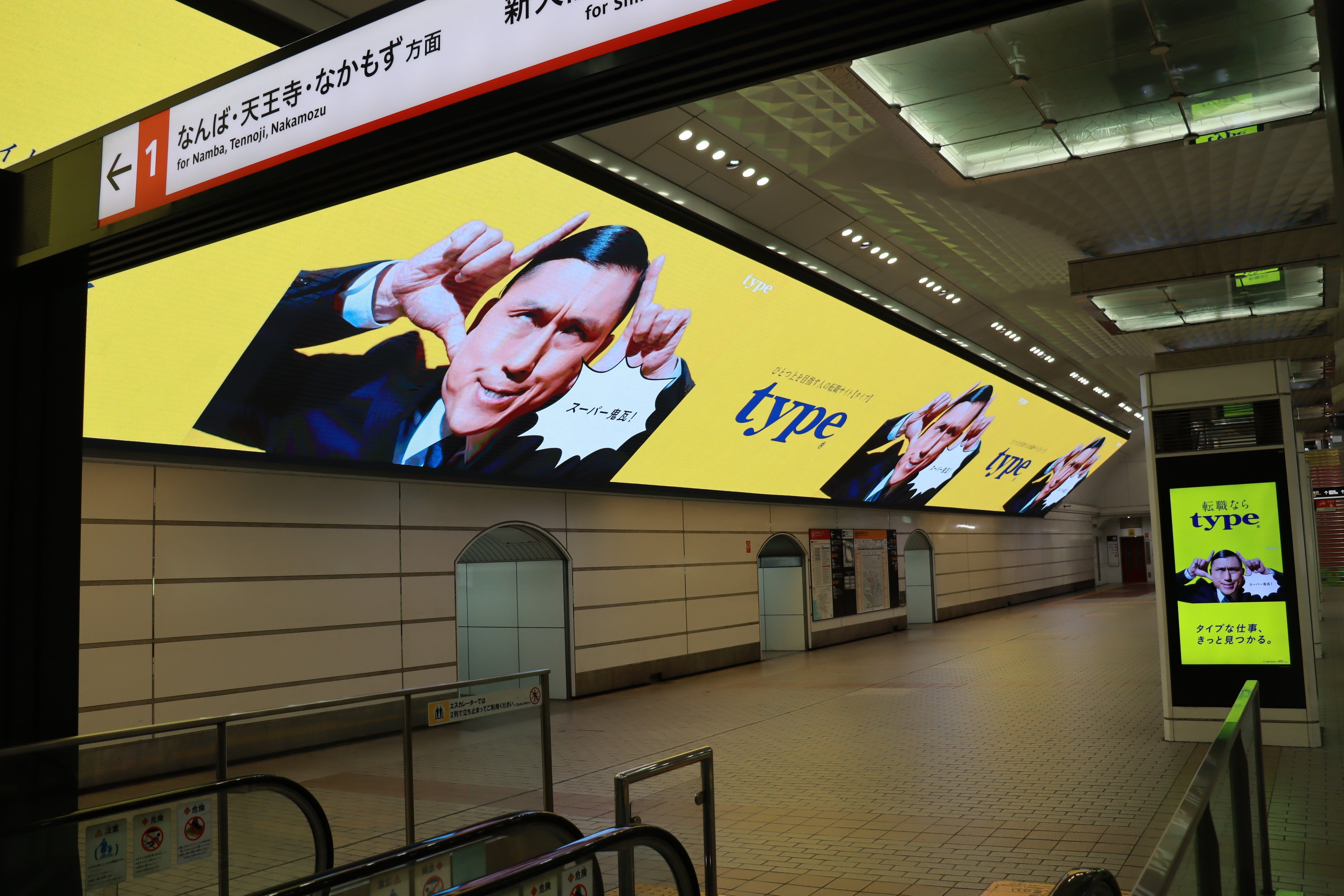 本媒体の広告ジャックは大好評につき4回目となります。『type』は、イメージキャラクターであるオードリー出演の6本のCMを盛り込んだ動画を展開!春日さんと若林さんの漫才のような掛け合いや新ギャグも必見です。『女の転職type』もかわいいリトルミイが巨大な画面内を駆け回るキュートな動画を展開いたします。地下空間での世界最大級LEDモニター「Umeda Arch Vision」の大迫力画面で、ぜひこちらの動画をお楽しみください。