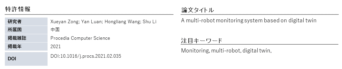 中国科学アカデミーらのグループは、複数のロボットの衝突を防ぐ研究を行っています。複数台のロボットがそれぞれのタスクにより自動走行することが想定されますが、それらを衝突することなく連携させることは難しいので、デジタルツインを活用してロボットの動きをシミュレートするマルチロボット監視システムを提案しています。