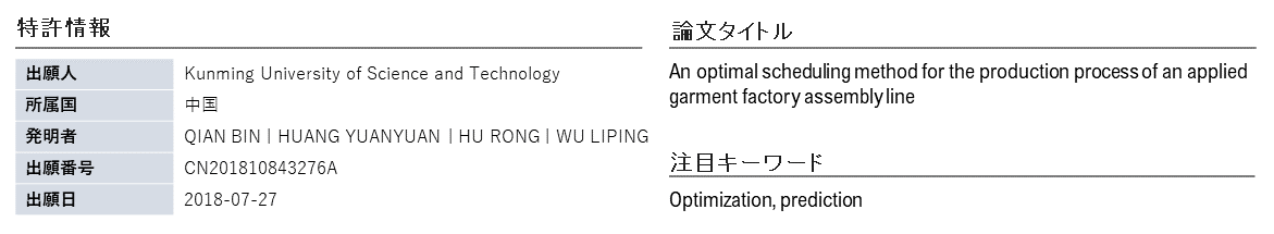 データベースの解析では、machine-learning、deep-learningなどのAI関連キーワード、fog、edge、quantumなどのコンピューティング関連キーワード、IoT、5G、 LoRaWanなどの通信関連キーワードが近年急速に伸びていることが確認されており、モノづくりの領域においてもデジタル化、すなわち機械化が急速に進んでいることがわかります。さらに、生産工程の最適化に関連するscheduling、optimization、scheme、grey wolfなどのキーワードは特に特許において伸びており、実用段階に入ってきているものと考えられます。