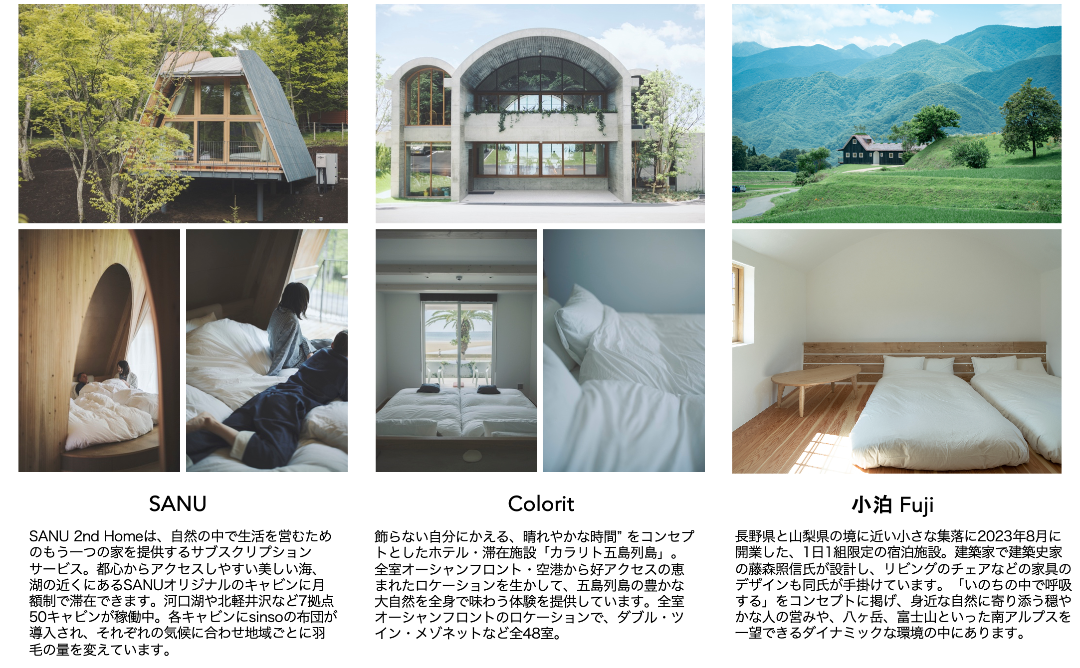 sinsoはこれまで、SANUやColorit、小泊Fuji などの宿泊施設に布団やリネン類を導入していただいてきました。さらに自社でも山梨県内にて宿泊施設を運営しており、それらの経験を通じていただいたお客様からのフィードバックを元に商品開発・改善を行っています。(導入事例は以下のとおり。)