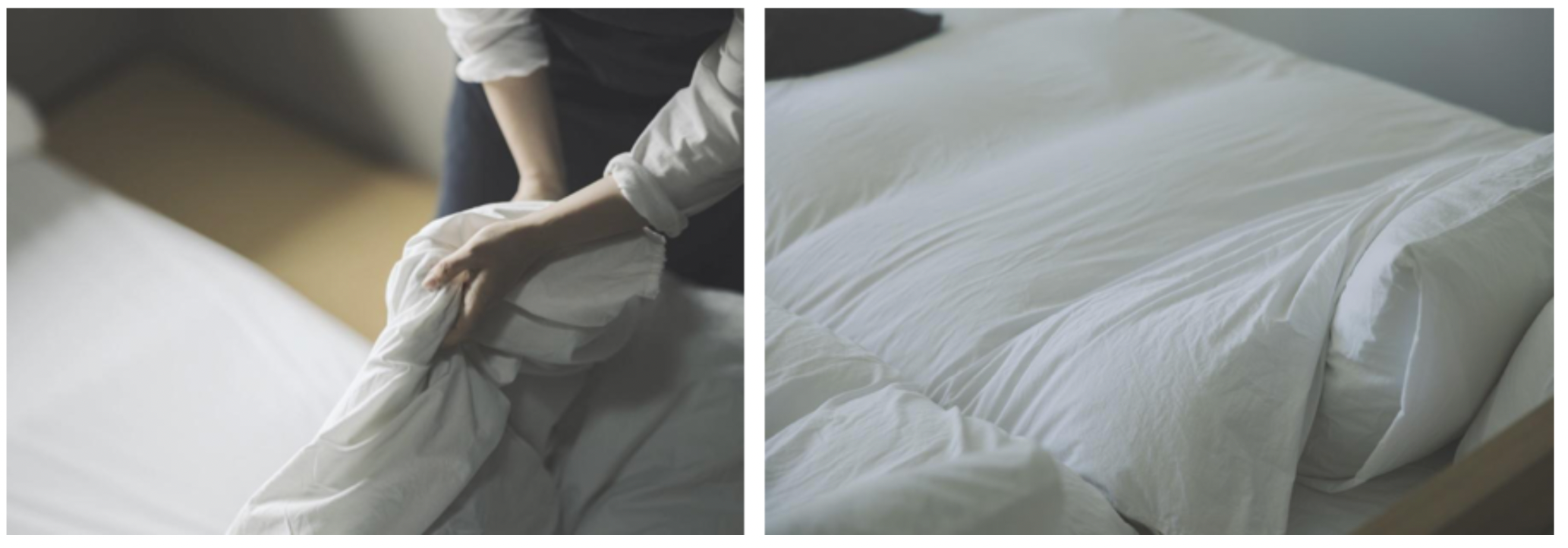 当ブランドでは、布団の気持ちよさを最大限引き出すために、シーツとカバーは綿100%のみを扱い、かつ寝具業界としては非常識な “洗いざらし” でお届けすることをデフォルトとしています。肌に気持ちよく馴染むように、そして環境にもやさしい商品を提供するべく、糊付けしてアイロンをかけることをやめました。静電気が発生しにくいだけでなく、高品質な綿の質感が生まれることで擦れた音さえ心地良く、綿本来の良さが引き出されると考えています。