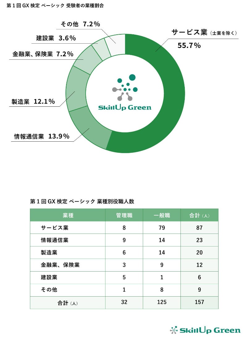 「GX検定 ベーシック」の第1回試験は今年6月に実施され、165名の受験者のうち、112名が合格しています。また、受験者を業種別に見ると、サービス業(士業を除く)が55.7%で最多となり、情報通信業と製造業が続きました。
