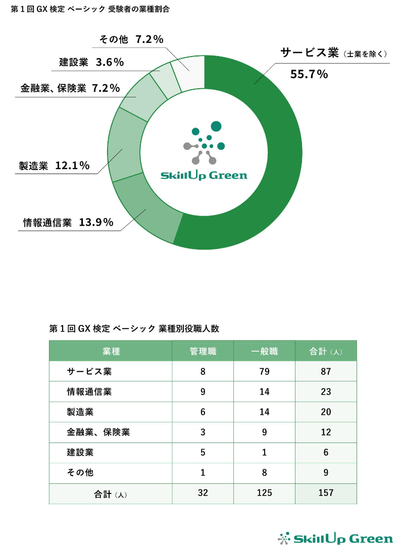 「GX検定 ベーシック」の第1回試験は今年6月に実施され、165名の受験者のうち、112名が合格しています。また、受験者を業種別に見ると、サービス業(士業を除く)が55.7%で最多となり、情報通信業と製造業が続きました。