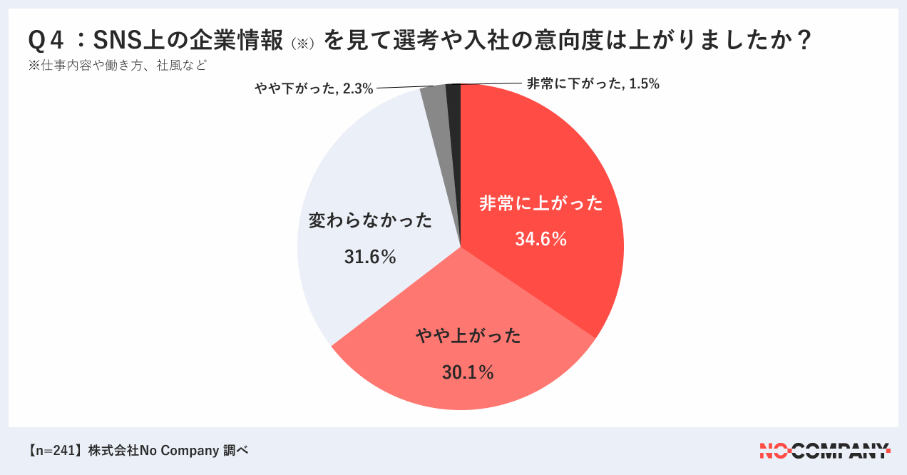 (考察)68.6%の学生がSNS上で企業の情報を検索し、その情報を見て64.7%が選考や入社意向度を高めていることが分かります。2022年に当社が取った同様のアンケートでは「非常に上がった」が17.3%で今回の約半分でした。SNSの情報が学生の就職活動にとって大きな影響を持ち始めていると言えます。