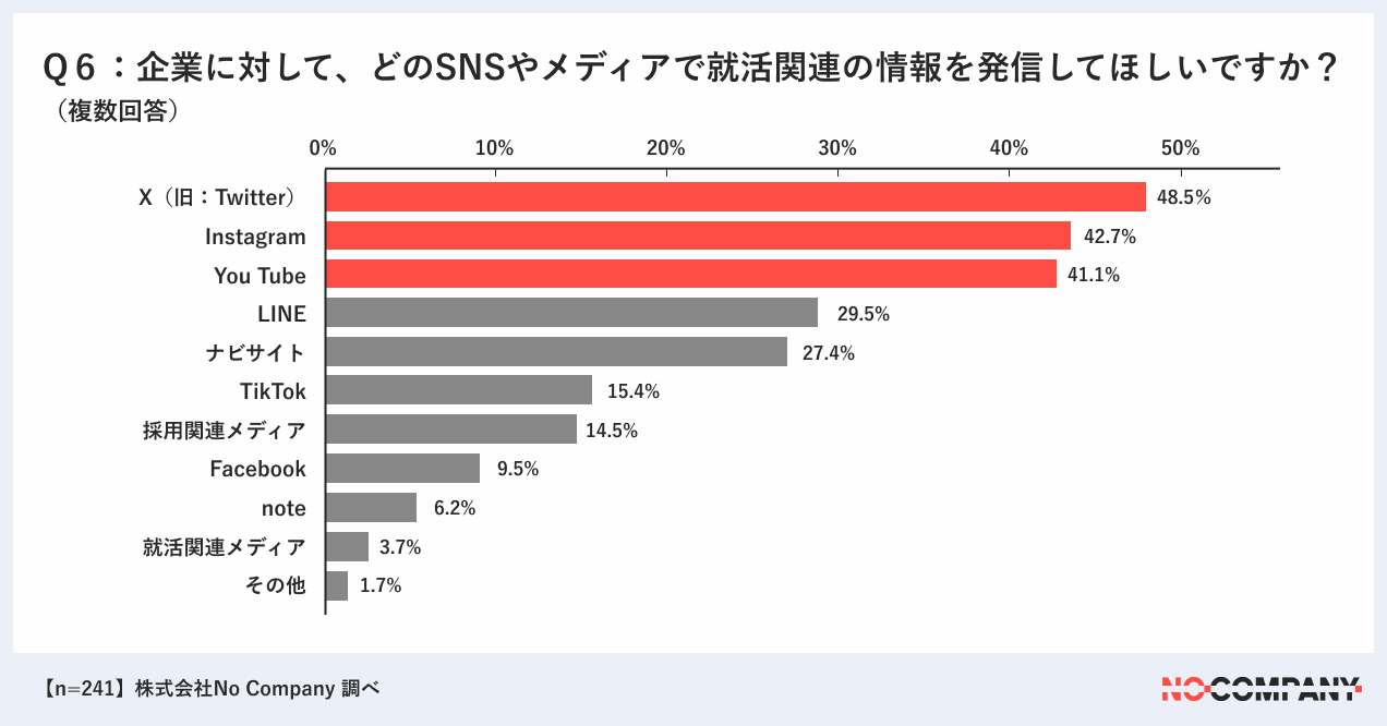 (結果)X(旧:Twitter)(48.5%)、Instagram(42.7%)、YouTube(41.1%)がトップ3