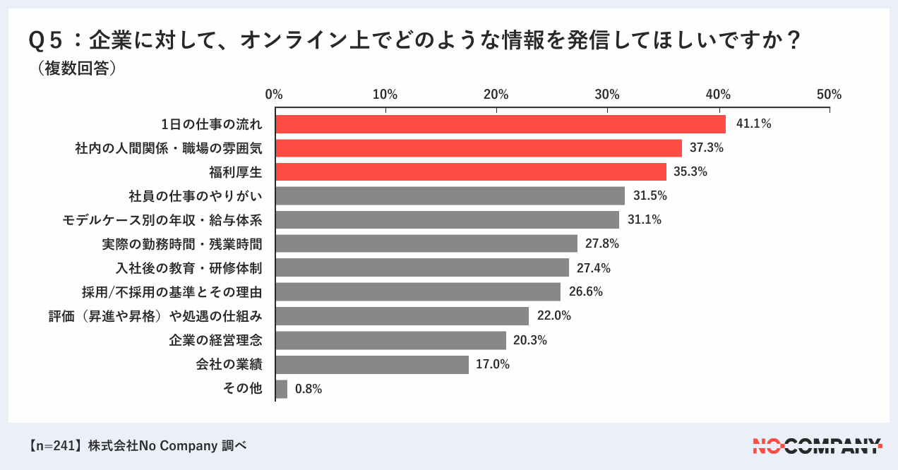 (結果)「1日の仕事の流れ」(41.1%)、「社内の人間関係・職場の雰囲気」(37.3%)、「福利厚生」(35.3%)がトップ3