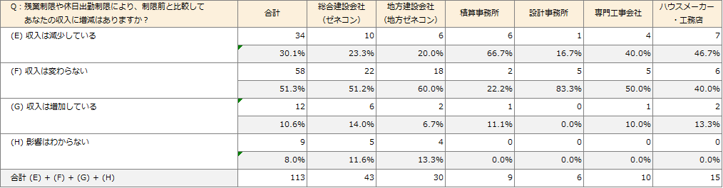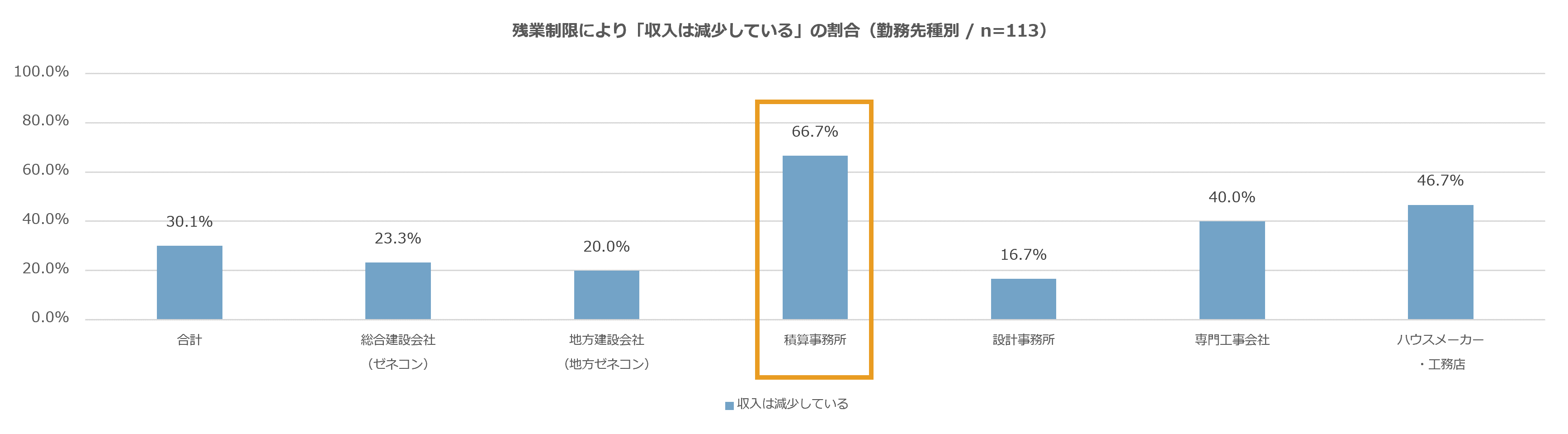 残業・休日出勤が「すでに制限されている」積算従事者のうち、制限前と比較して「収入は減少している」と回答した方の割合は、全体平均では30.1%、勤務先種別では積算事務所が66.7%、ハウスメーカー・工務店が46.7%、専門工事会社が40.0%、総合建設会社(ゼネコン)が23.3%、地方建設会社(地方ゼネコン)が20.0%、設計事務所が16.7%となりました(n=113)。特に「積算」を専門に行う積算事務所勤務の方の割合が際立って高く、残業制限による時間外手当・残業手当の減少が収入の減少に直結していることがわかります。