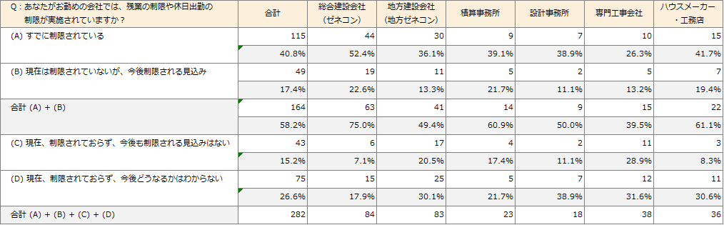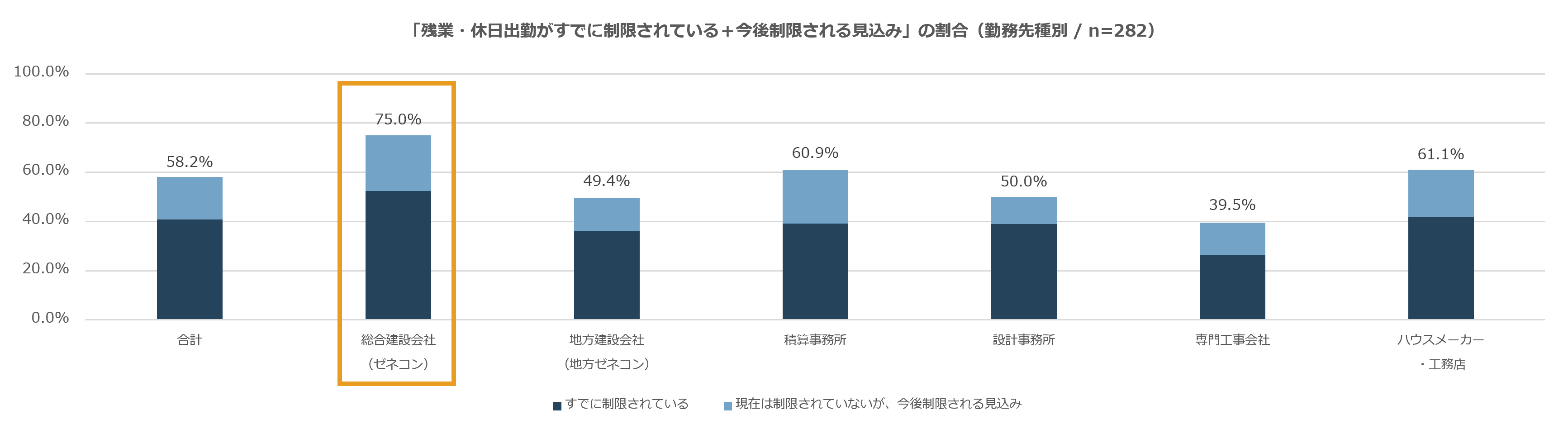 ●建築積算従事者のうち、残業制限が実施されている(制限見込みを含む)のはゼネコン勤務の75.0%が最も高い。全体平均では58.2%。