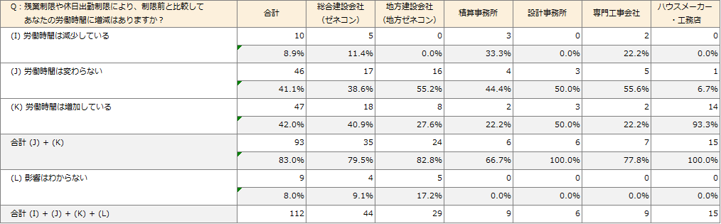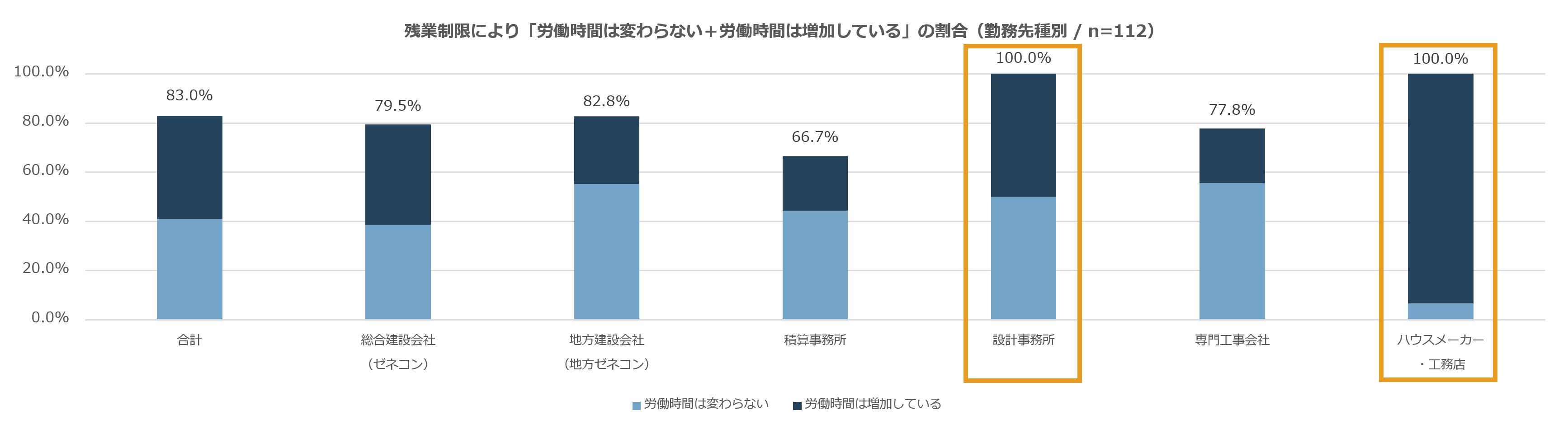 残業・休日出勤が「すでに制限されている」積算従事者のうち、「労働時間は変わらない」方は全体平均で41.1%、「労働時間は増加している」方は全体平均で42.0%、合算すると83.0%でした。勤務先種別では設計事務所が100.0%(50.0%+50.0%)、ハウスメーカー・工務店が100.0%(6.7%+93.3%)となりました(n=112)。残業制限が実施済みにもかかわらず、労働時間が減っていない積算従事者は、約8割にのぼる結果となりました。設計事務所・ハウスメーカー・工務店勤務の積算担当の方では、労働時間が減っていないのは100%となり、残業制限は労働時間削減には寄与しておらず、積算業務の業務過多の状況が見てとれます。