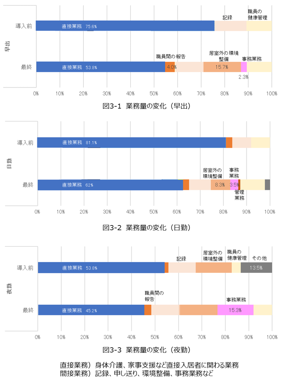 当初はICT見守り機器導入と業務整理により直接業務の増加を予測していたが、図3-1,2,3にあるように直接業務は減少した。ICT見守り機器導入により、入居者の行動に合わせたタイミングのよいケアが可能になったことが影響。例えば排泄介助では、入居者が起きて離床するとICT機器が反応するため、そのタイミングで介助に入ることができる。ICT見守り機器導入前は、介護士が排泄の時間に声をかけるが入居者が拒否し後で介助に入るなど無駄になる時間があった。ICT見守り機器導入により効率的なケアの実施が可能となり、生産性の向上につながったと考えられる。