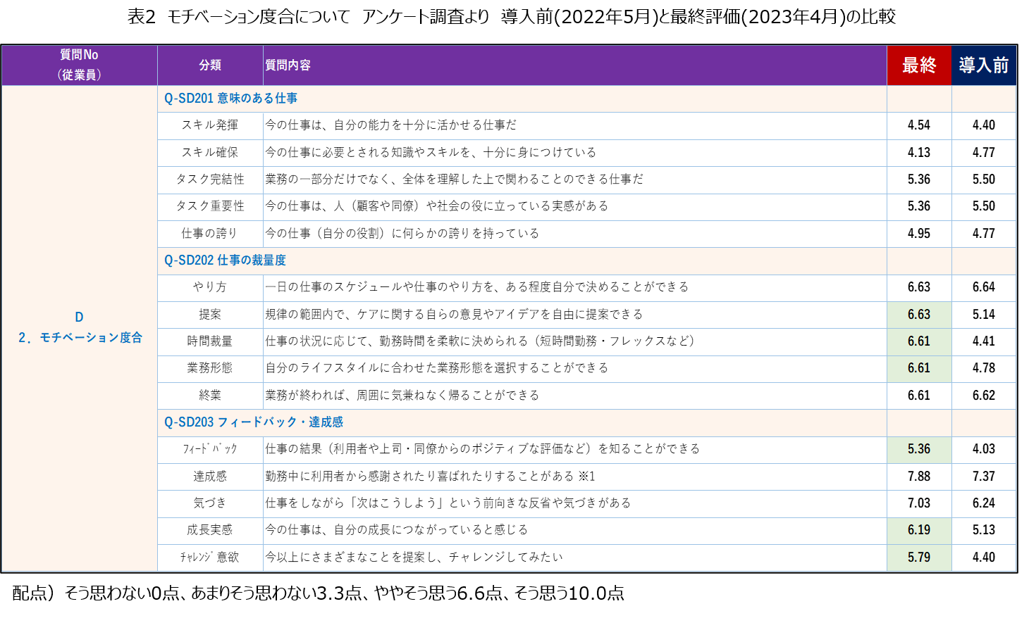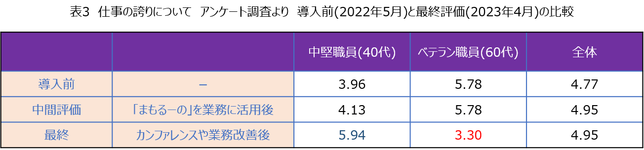 表2にあるように、職員のモチベーションは向上しているが、意味のある仕事(Q-SD201)については変化を認めなかった。その項目内の「仕事の誇り」では、表3にあるように中堅職員(40代)は向上、ベテラン職員(60代)は低下していた。職場での様子や個別面談の結果から、導入前は中堅職員はベテラン職員に対して介護の経験が浅いため自己肯定感が低く、言動も控えめで積極的な発言や提案が少なかった。しかし導入後、中堅職員はデジタル操作に慣れているという強みを活かしデータを介護に活用することで、問題意識が高まり提案やチャレンジ行動が増えたと考えられる。一方ベテラン職員は経験値で力を発揮していたが、経験値の部分をデータ化してしまうため自身の優位性が落ちたとも考えられる。今後はそれぞれの得意分野を活かした管理者によるマネジメントが必要である。