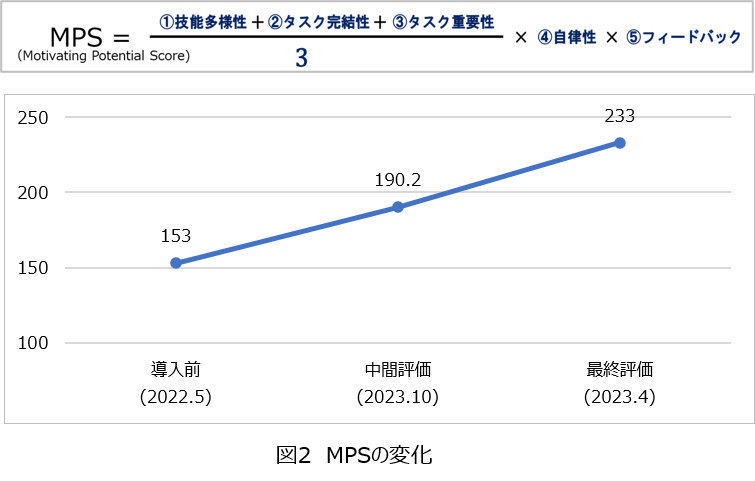 ハックマン・オルダムの「職務特性モデル(Job Characteristics Model)」において提唱されている計算式を用いて評価した。図2にある通り、導入前と比較すると80ポイント向上した。特に自律性、フィードバックの向上を認めた。