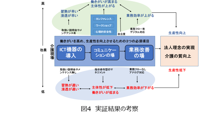 ICT見守り機器の活用は、職員の働きがいの向上を認めた。また無駄の少ない直接的な介護業務を実施するという点で生産性向上に影響したと考えられる。ICT見守り機器を効果的に活用するためには、導入準備(リスキリングの機会)、データを活用するコミュニケーションの場づくり、業務改善の実施が必要な条件であることが明らかになった。