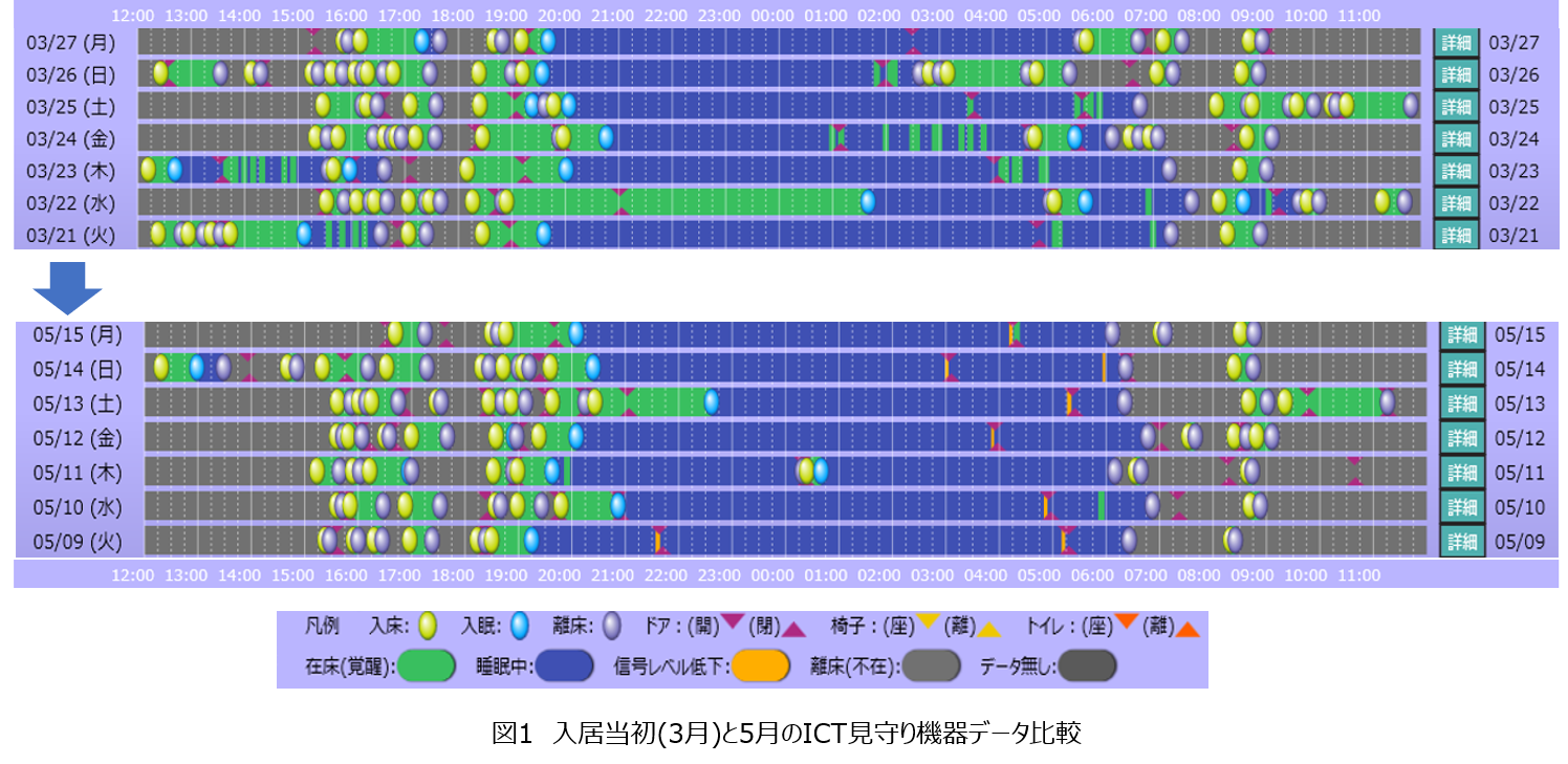 表1にあるように職員同士のコミュニケーションの改善を認めた。ICT見守り機器から得られるデータをもとに、グループワーク、カンファレンスを実施していくことで職員間のコミュニケーションが活発になった。個で実施する業務からチームで実施する業務に変化していると考えられる。