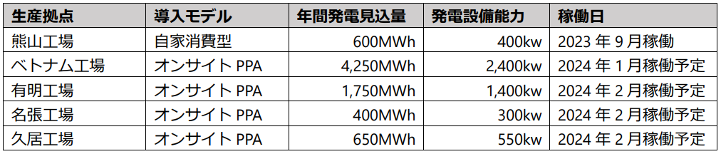 さらに来年1月よりベトナム工場、2月より有明工場、名張工場、久居工場の計4拠点で、オンサイトPPAによる太陽光発電設備を導入予定です。こちらの4拠点による発電見込量は7,050MWh、発電設備能力は4,650kwとなり、年間のCO₂削減量は3,700tとなる見込みです。