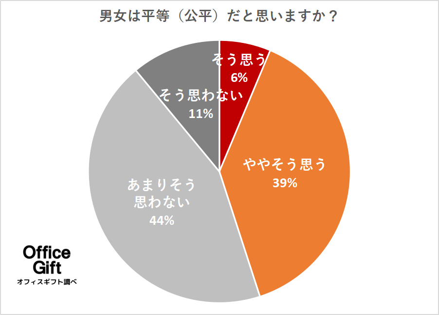 「そう思う」「ややそう思う」の総数が135、「あまりそう思わない」「そう思わない」の総数が165と、平等ではないと考えている方が若干多い傾向ですが、両者に大きな開きはみられませんでした。