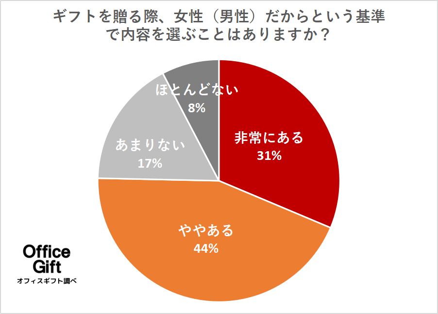 「ギフトを贈る際、女性(男性)だからという基準で内容を選ぶことはありますか?」という設問に対し、7割以上の方が「非常にある」「ややある」と回答する結果になりました。