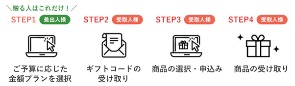また、受取人様は「ギフトコードを入力→好きな商品を申し込む」だけなので、申し込みの負担もほとんどなく、周りの目を気にする必要もありません。