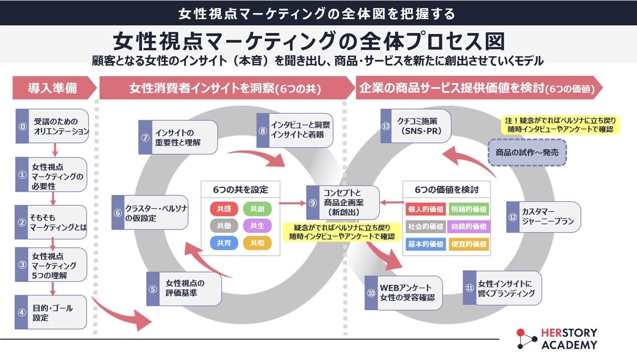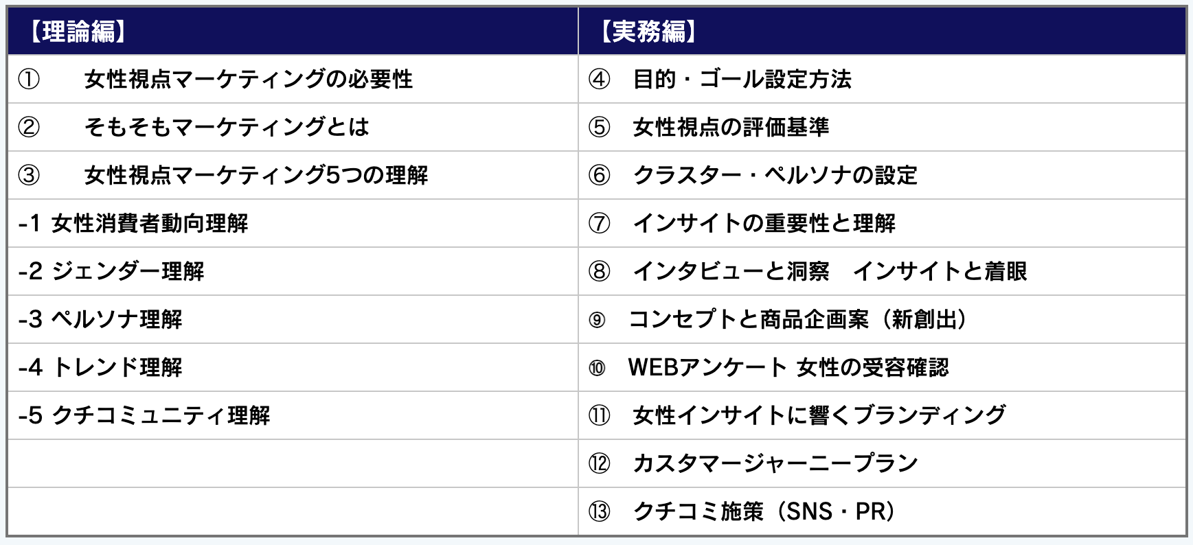 カリキュラムは【理論編】【実務編】に分かれ、動画全17本・約8時間となっています。こちらのステップにのっとって、導入準備から女性消費者のインサイトの洞察、企業の商品サービス提供価値を検討していき、女性視点マーケティングを学んでいきます。