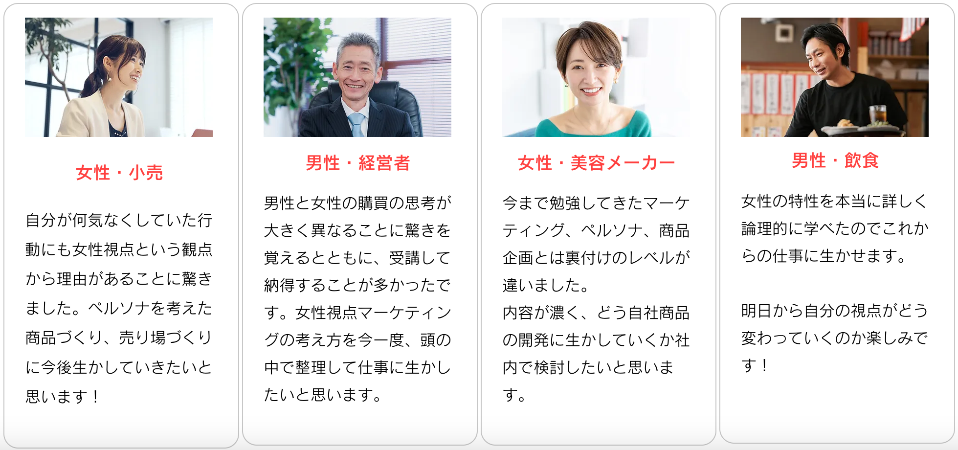 マーケター、商品開発、販売促進、新規事業、経営者など、幅広い分野、業種の方々に新ビジネスの創出機会として支持をされてきました。オンライン講座を開始したことで、様々な就業スタイルやライフスタイルに沿って受講できることが魅力です。