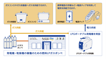 災害対応型ランドリーは「標準仕様」として3日分のLPガスを貯槽できるLPガスボンベ、ポータブル発電機への接続が可能な設備を完備します。ポータブル発電機はガスを利用して発電する仕組みになっており、携帯電話充電などへ電力供給することが可能です。また、店舗にガスコンロ、ガス炊飯器を導入し、被災者向けの炊き出しが可能となり、コインランドリーを“一時避難所“として活用する事ができます。