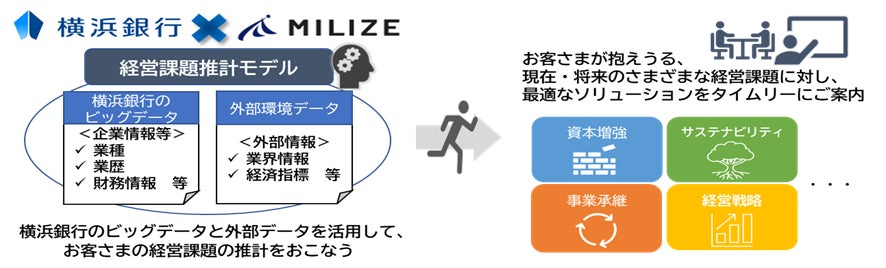 「Hamagin DG Innovation Fund」(※)の出資先である株式会社MILIZE(代表取締役社長 CEO 田中 徹)とコンコルディア・フィナンシャルグループの横浜銀行(代表取締役頭取 片岡 達也)は、法人分野における営業情報高度化の研究として、AI技術を活用した「経営課題推計モデル」の構築に共同で取り組んでいくことに合意しましたので、お知らせします。