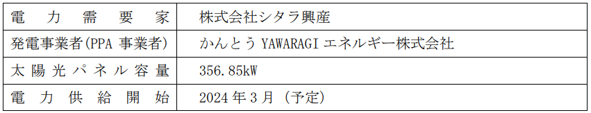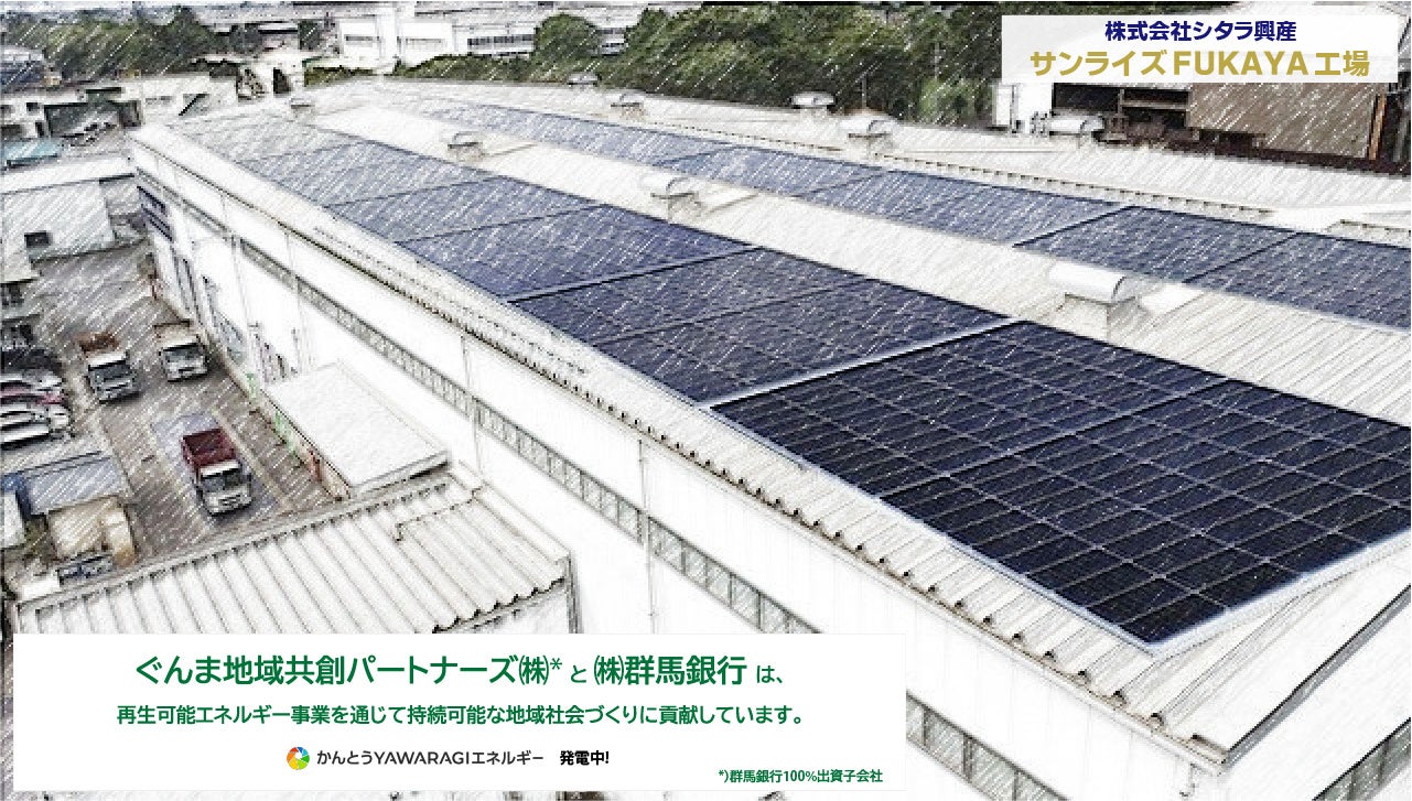 かんとうYAWARAGIエネルギー株式会社(代表取締役 三村挑嗣、以下「当社」)と株式会社シタラ興産(代表取締役 設樂竜也、以下「同社」)は、同社サンライズFUKAYA工場の屋上にオンサイトPPA*モデルによる太陽光発電システムを設置し、同工場で使用する電力の一部を再生可能エネルギーに切り替えるための契約を締結しましたので、下記のとおりお知らせいたします。