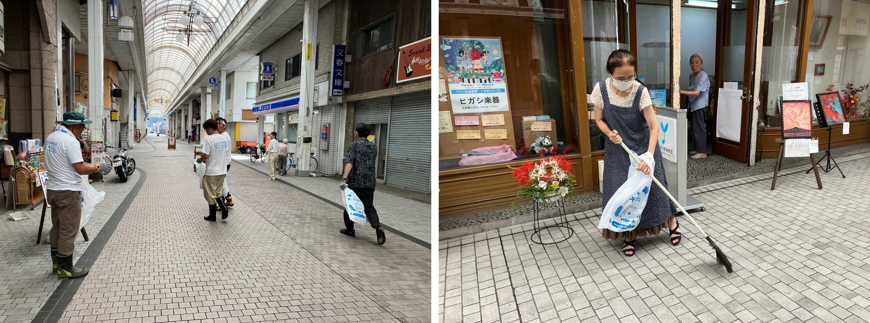 今回の清掃活動には、元気な商店主さんを中心に約40人が集まり、商店街や近くの一條神社の境内などを歩いて、ていねいにごみを拾い集めました。