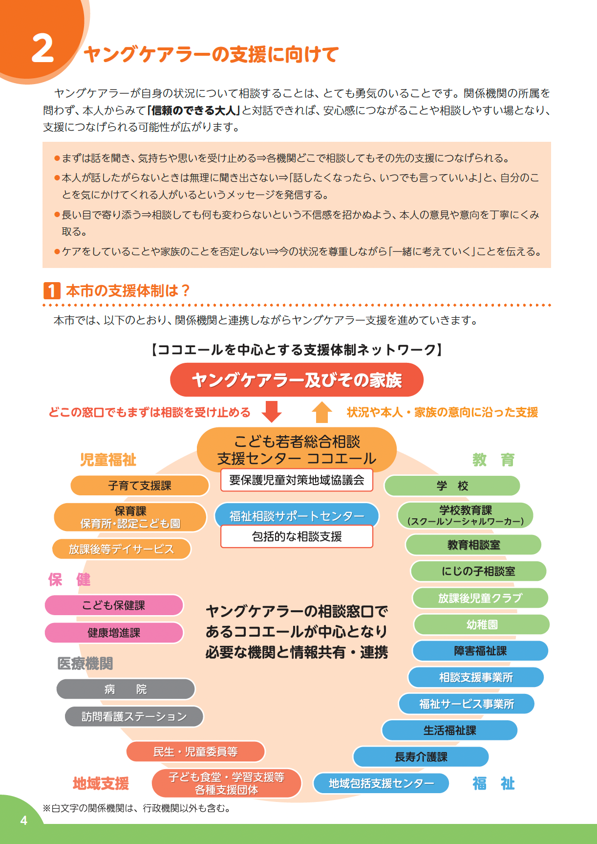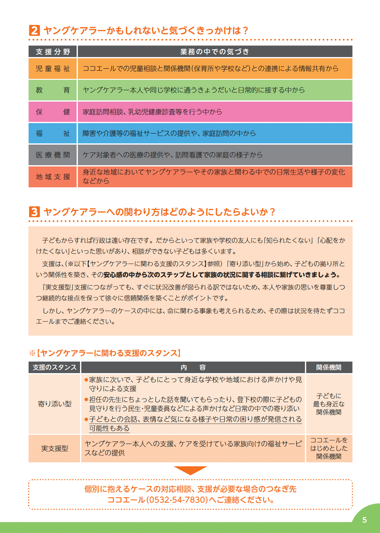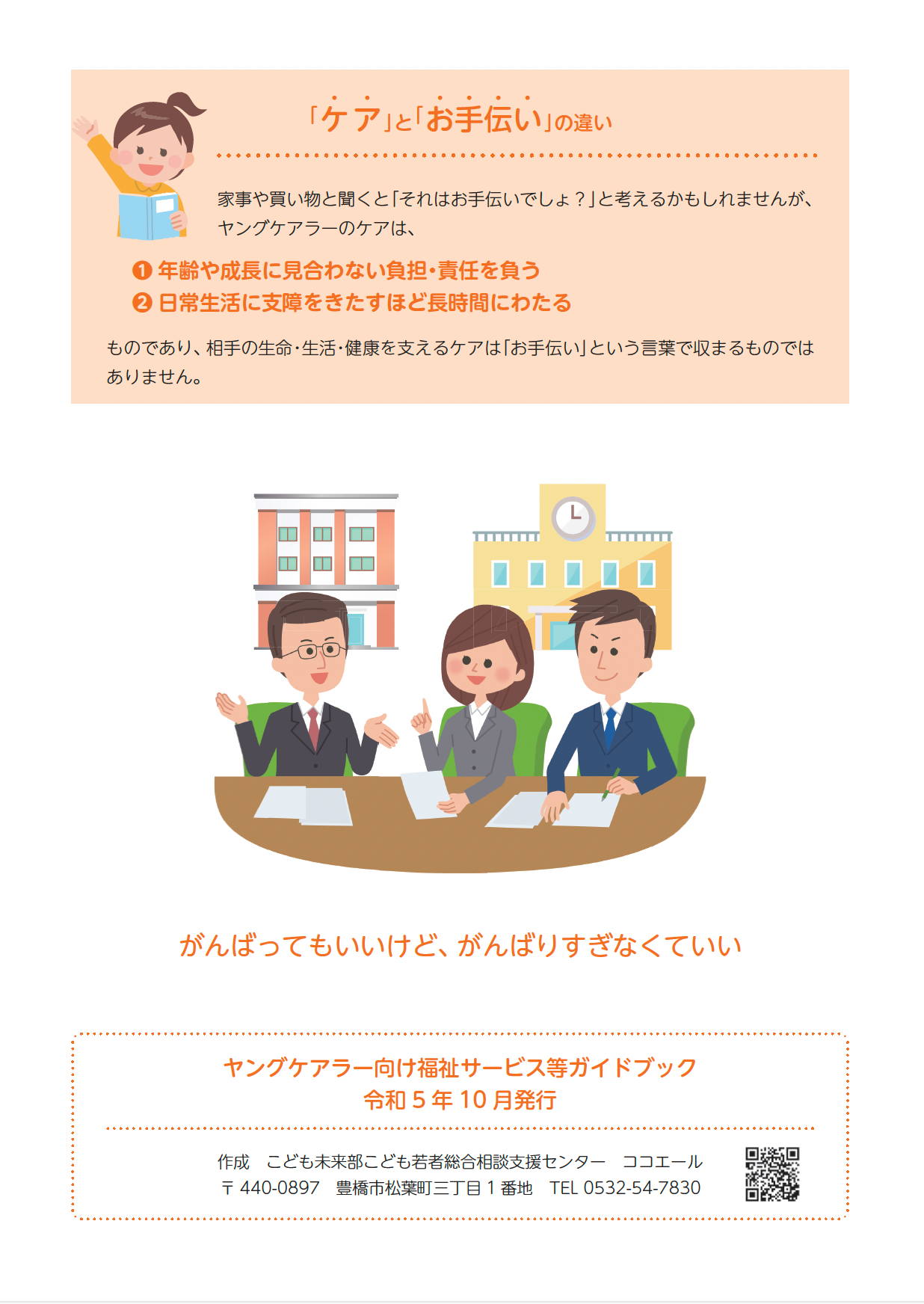 豊橋市こども若者総合相談支援センター「ココエール」では、ヤングケアラーについて認知度を上げるため、コーディネーター採用による支援体制の強化、関係機関の研修などに取り組んでいます。また、ヤングケアラーとその家族に対して洗濯や掃除、料理などの家事支援サービスの利用も支援します。