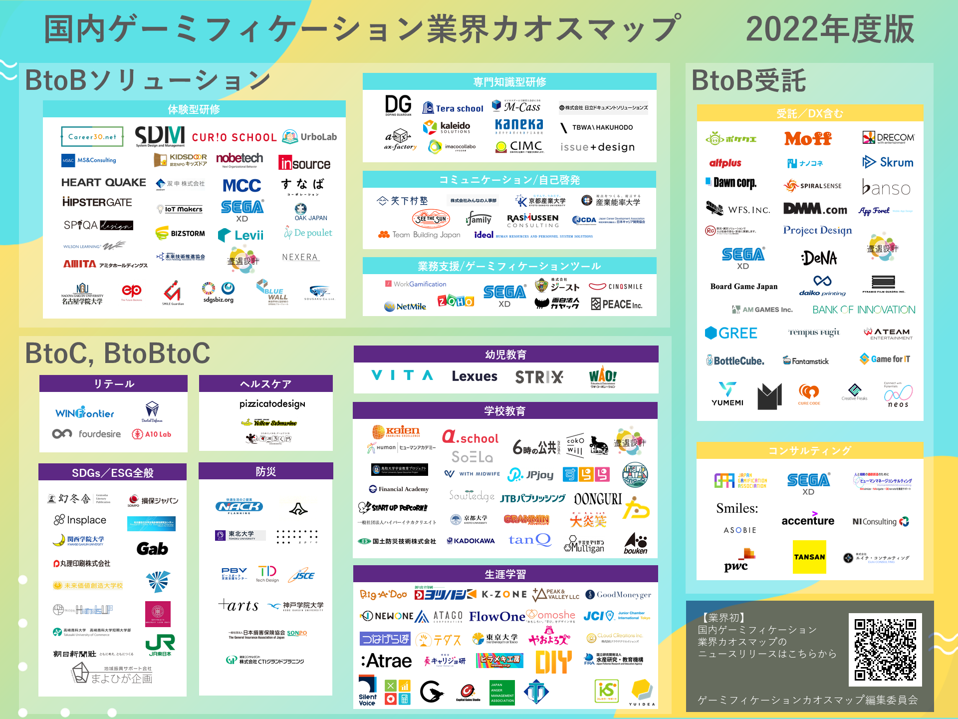 そこで、当社は日本のビジネスパーソンに対して広く『ゲーミフィケーション』の有用性を認識いただき、『ゲーミフィケーション業界』の存在を知っていただきたいと考え、本委員会の事務局を担当して、『国内ゲーミフィケーション業界カオスマップ 2022年度版』を後述する本委員会メンバーと作成し、この度公開いたしました。