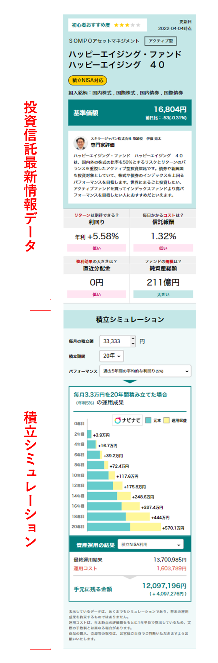 『ナビナビ積立シミュレーション』は、①投資信託商品最新データ、②積立シミュレーションツール、③記事(読み物)コンテンツの3つを組み合わせ、投資信託の選び方から購入方法までのすべてのステップを商品毎にサポートするハイブリッド型コンテンツです。