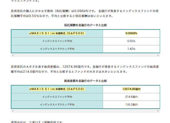 投資信託の購入にかかる手数料(信託報酬)と金融庁が発表するインデックスファンドの信託報酬平均の比較や、投資信託の大きさを表す純資産額と金融庁が発表するインデックスファンドの純資産額平均を比較することができます。